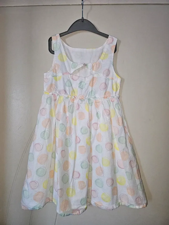 Jolie robe blanche à pois colorés, état neuf, portée 1 fois. Ouverture dans le dos Taille 8 ans, marque Vertbaudet