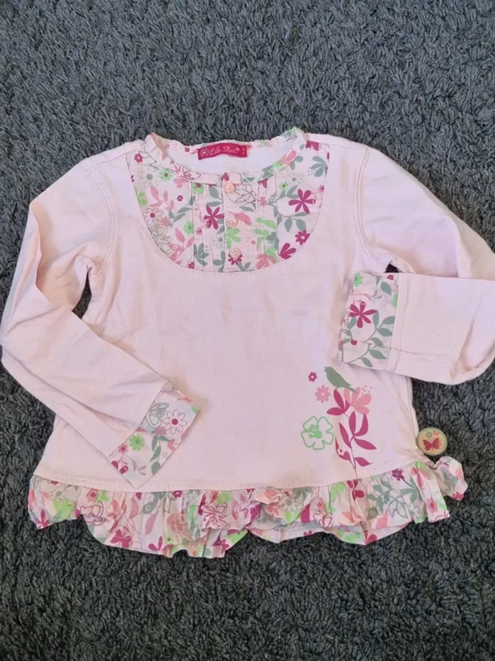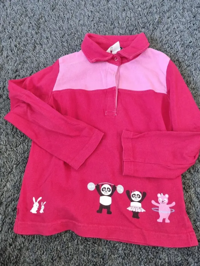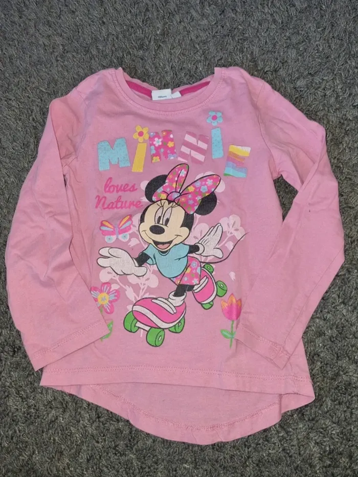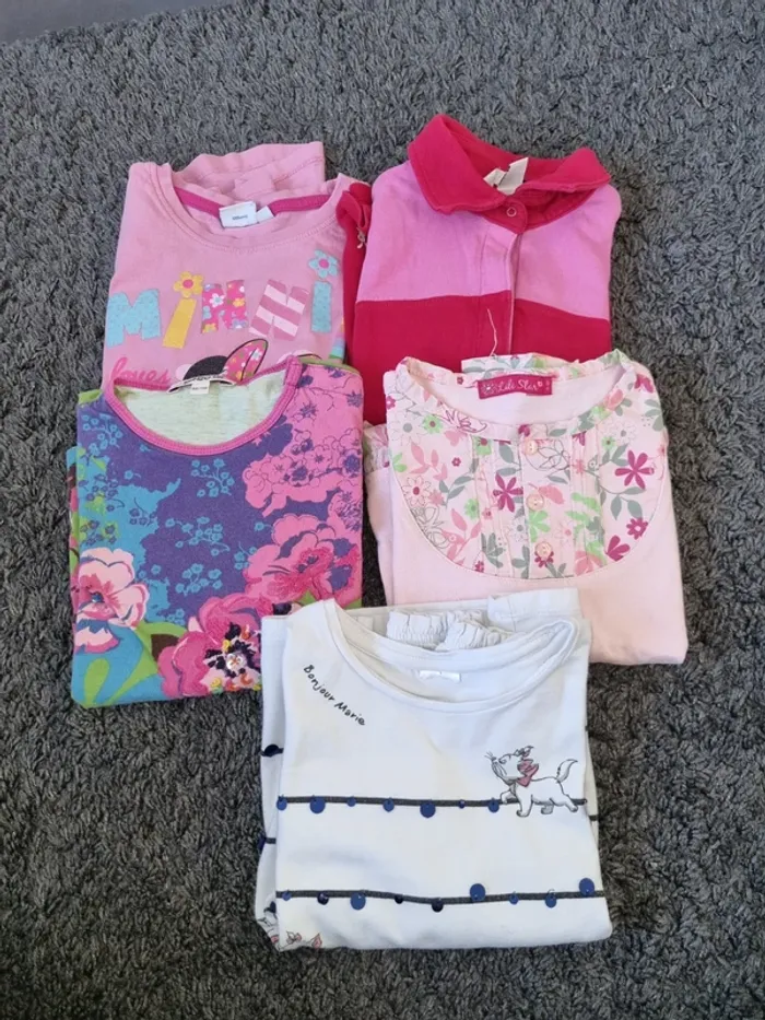 Lot de 5 t-shirts manches longues en bon état, taille 6 ans (sauf le rouge grand 5 ans) -blanc motif Marie Disney - rose fleurie Lili Stars - polo rouge et rose H&M (grand 5 ans) - fleurie Kenzo - rose motif Minnie Disney #6anssevy57