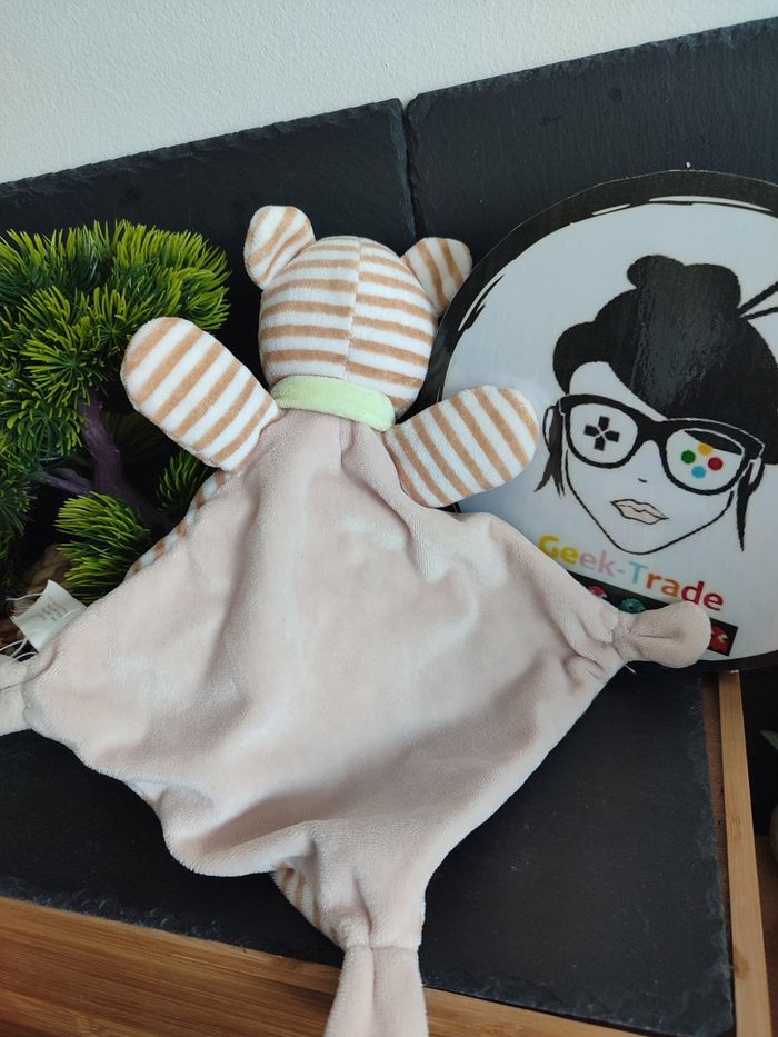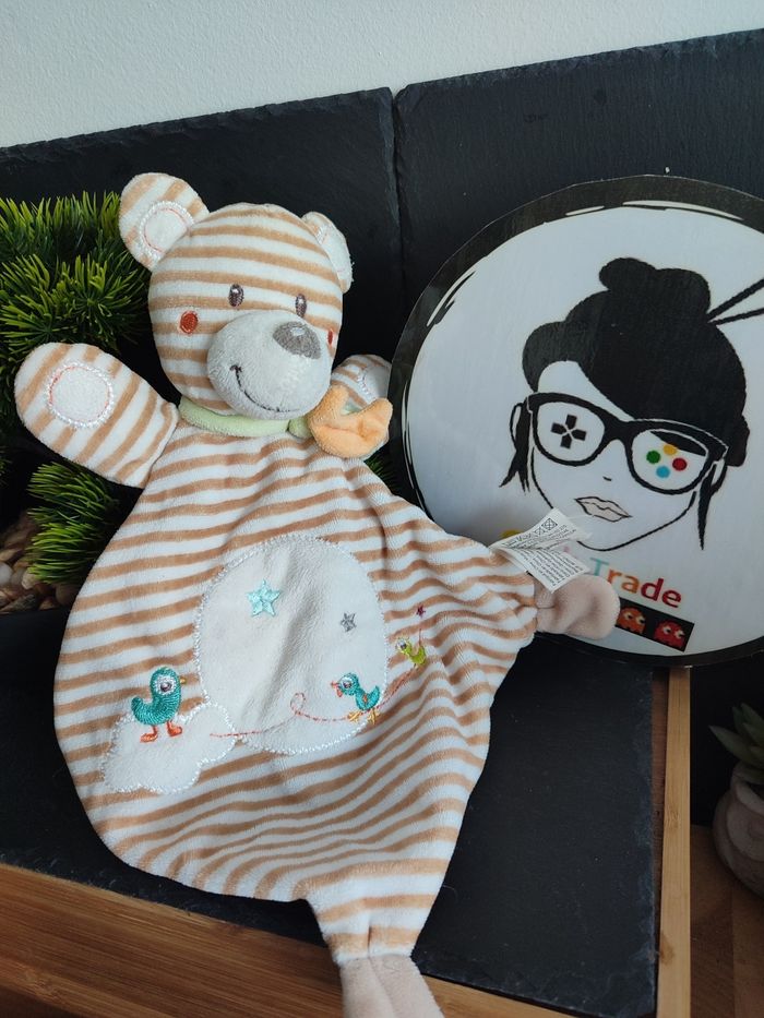 Doudou plat ours rayé marron blanc oiseaux écharpe nicotoy canard étoile nuage lune beige vert - photo numéro 1