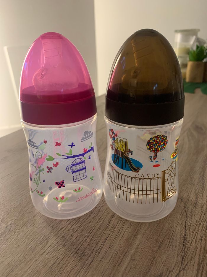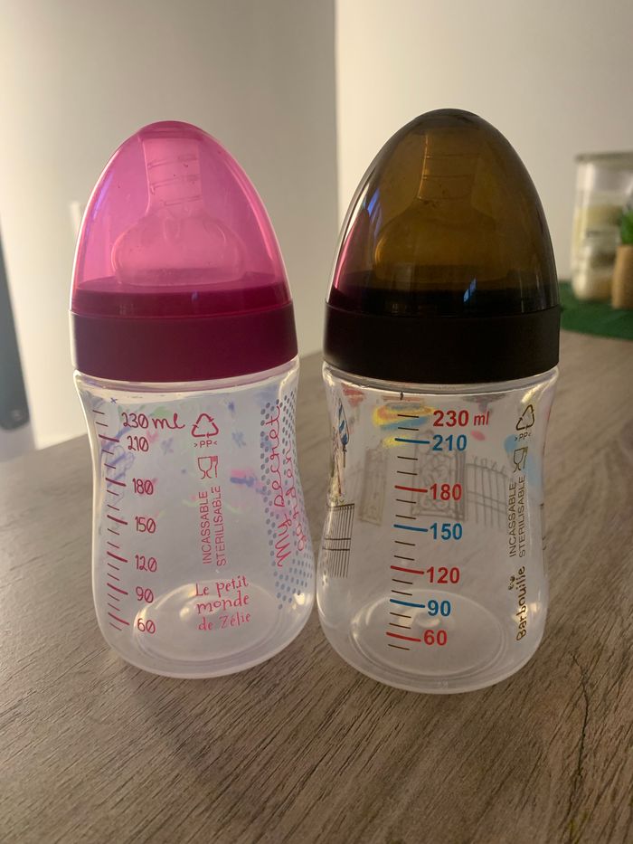2 petits biberons en plastique (230ml) Je les ai lavés et stérilisés mais ils n’ont pas servi car ma fille a adhéré tout de suite à une autre marque de biberons.