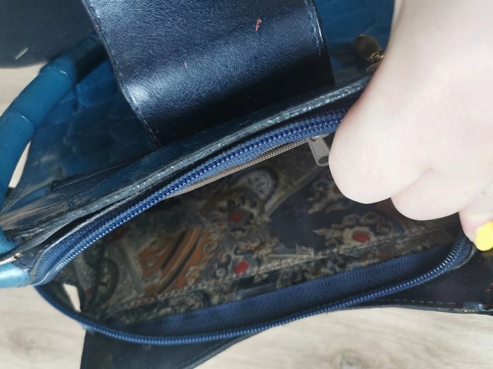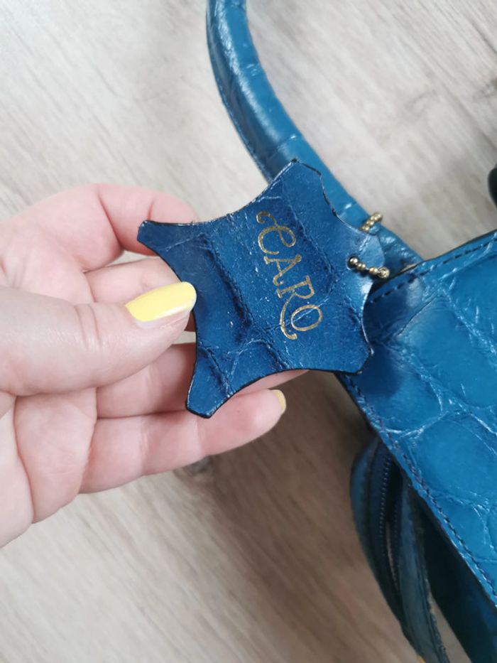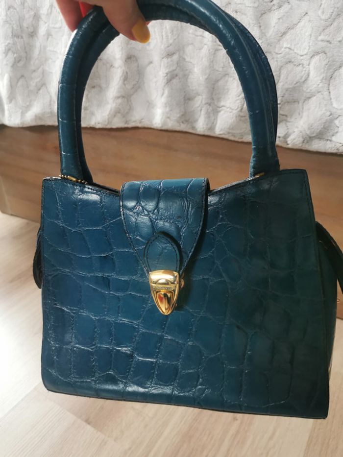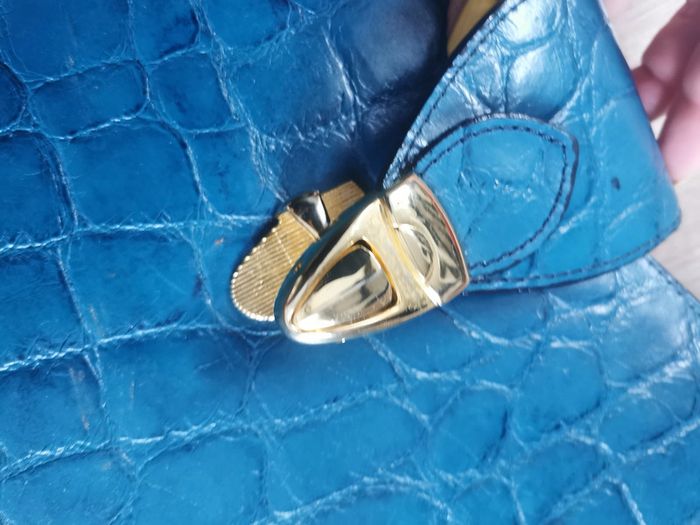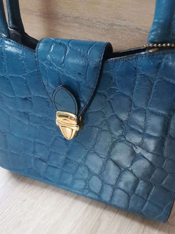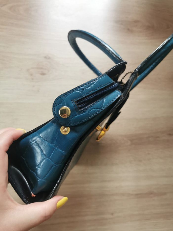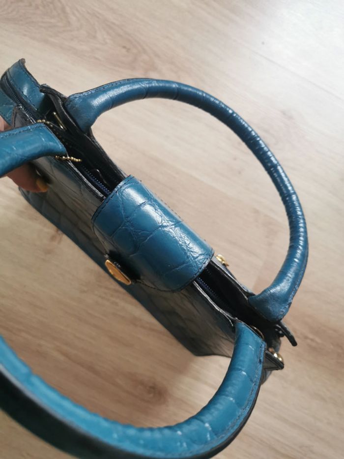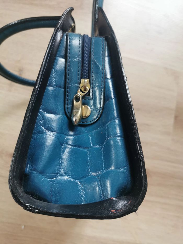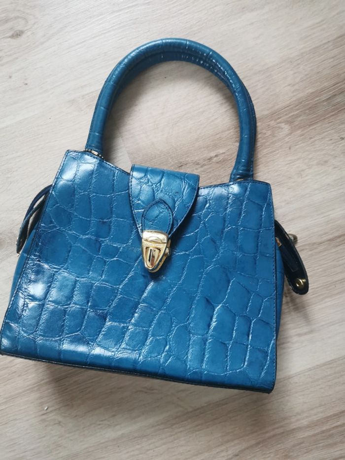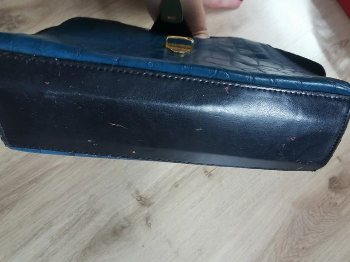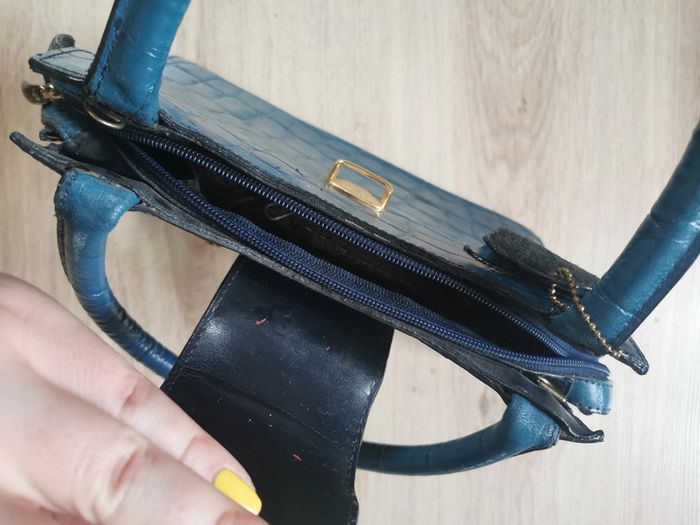 Sac à main cartable bleu vert vernis Caro. Sac à main, petit format avec deux poignées, sans bandoulière, mais a les anneaux pour, fermoir type cartable, poche zipée au dos. Le sac se ferme par une fermeture éclair, a une poche à l'intérieur et une poche à zip. Le sac est en simili cuir ou cuir ? je ne sais pas effet croco vernis, belle couleur bleu vert, en très bon état général, à l'interieur sur le côté on voit la colle, le dessous comporte quelques traces, les languettes des parties métalliques dorées sont un peu dépassées. Made in Korea. Dimensions : Hauteur : 21 cm Largeur : 25 cm Epaisseur : 8 cm Longueur poignées : 36cm Poids : 540g Pensez à faire des lots afin de bénéficier des remises que j'ai régulièrement sur ma page. #sacamain #sacamainbleumarine #sacamainbleuvert #sacamaincartable
