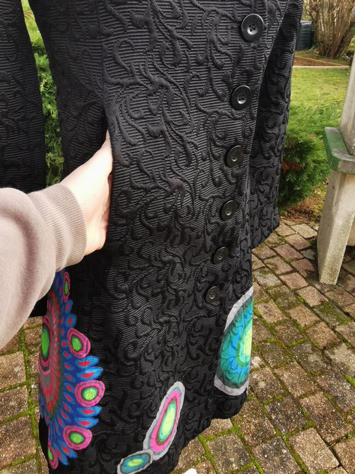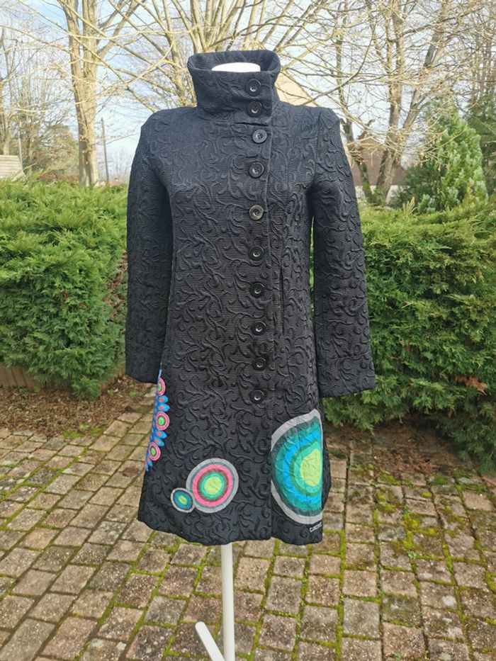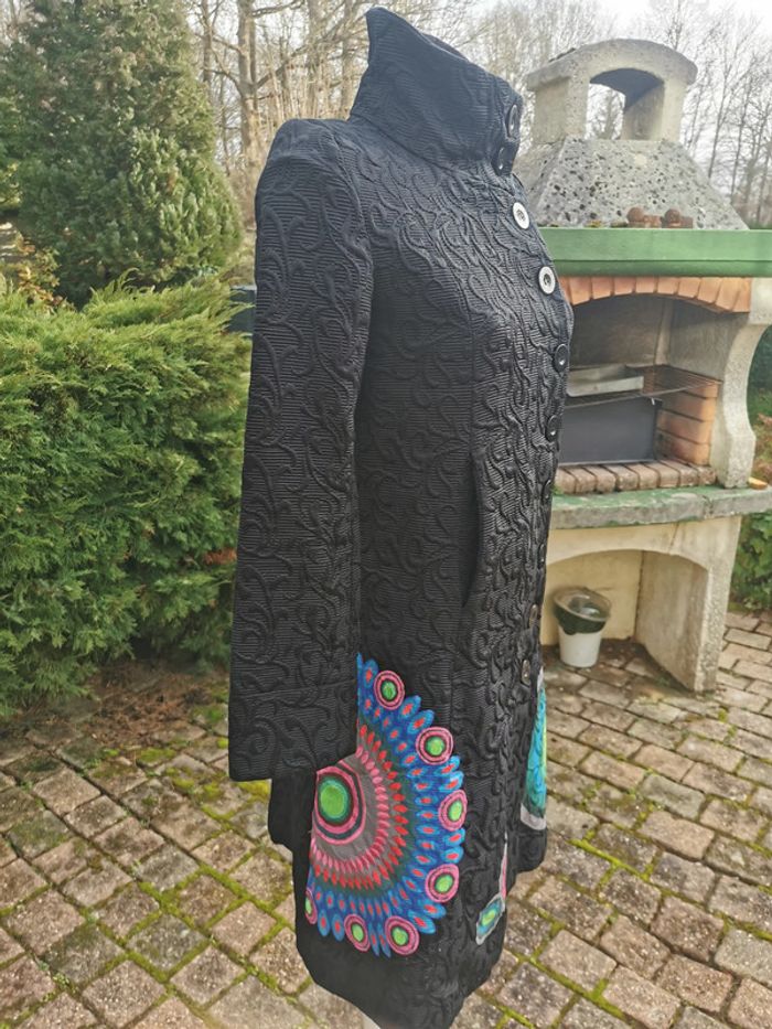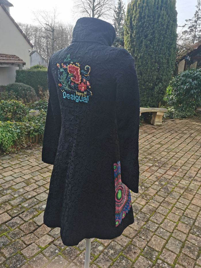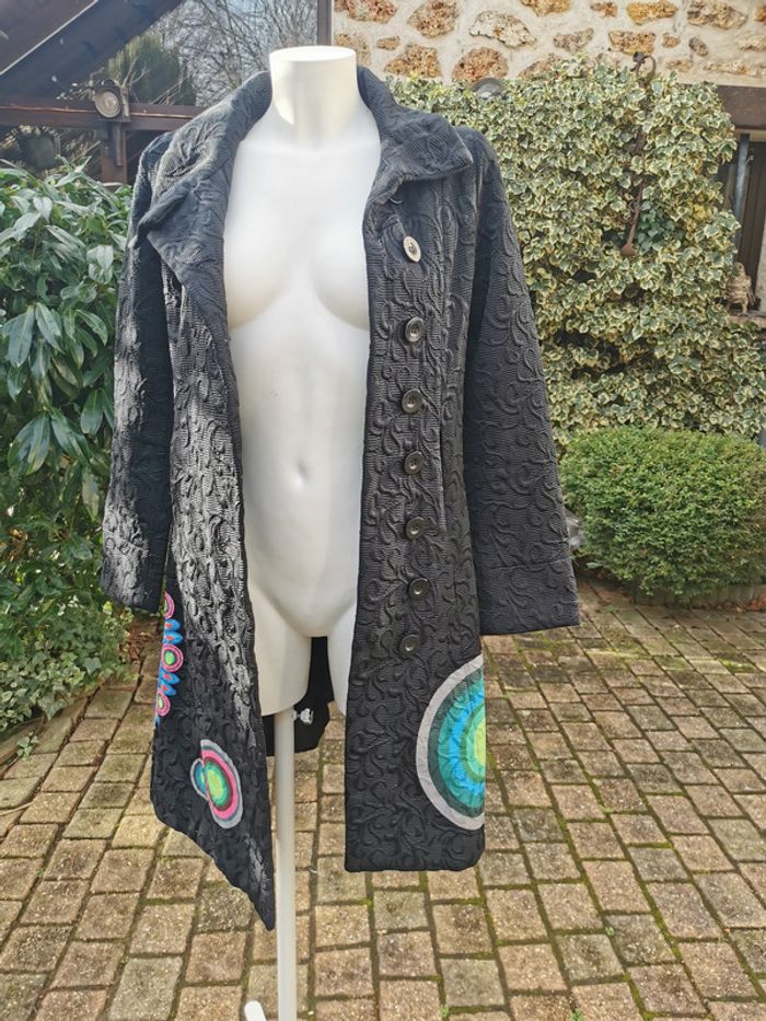 Beau manteau noir en 64% coton et 36% polyester, tissu à relief, la doublure est 100% polyester. Le manteau noir est décoré des autocollants partiellement brodés sur le bas de manteau et au dos la broderie très colorée, le manteau est légèrement évasé, le col montant à boutons, deux poches sur les côtés, taille 38. Le manteau est en très bon état général, présente quelques peluche ou fils sortis. Mesures : Longueur manteau : 92 cm Hauteur col : 10 cm Longueur de manche depuis l'épaule : 62 cm Longueur de manche depuis l'aisselle : 43 cm Largeur de manche : 16 cm Largeur de dos entre les aisselles : 44 cm Largeur des épaules : 37,5 cm Largeur taille : 41 cm Poids : 975g #manteaubrodé #manteaunoir #manteaucolmontant #manteauboutons #manteauevase #manteautaille38