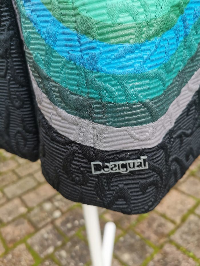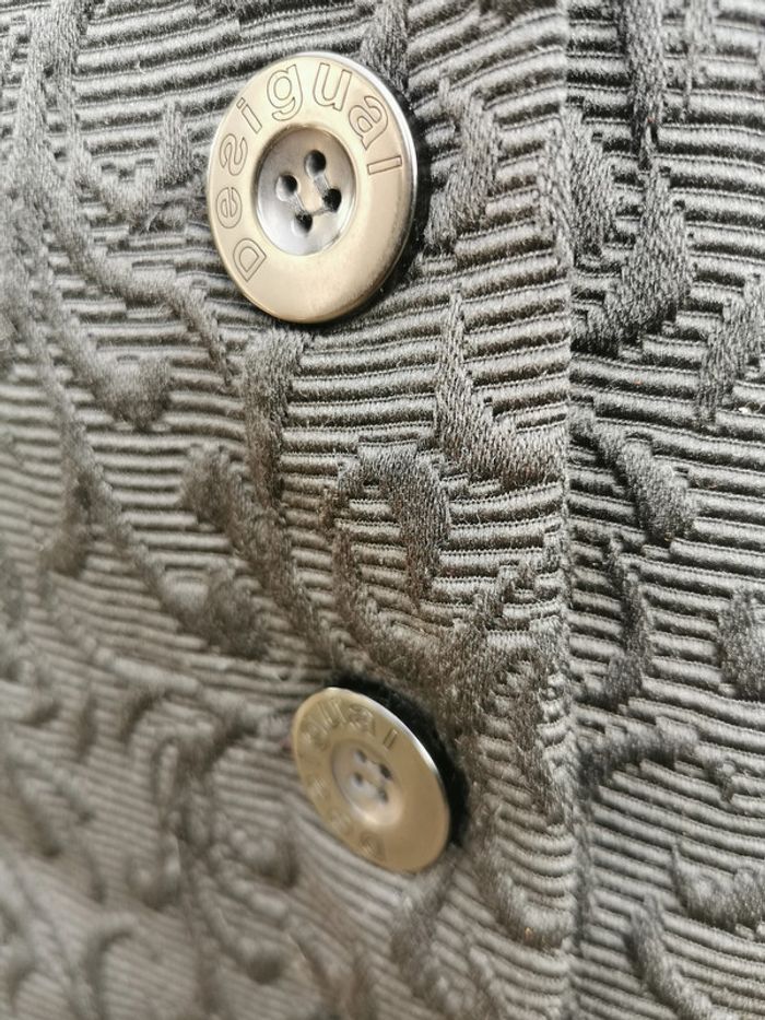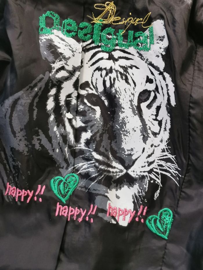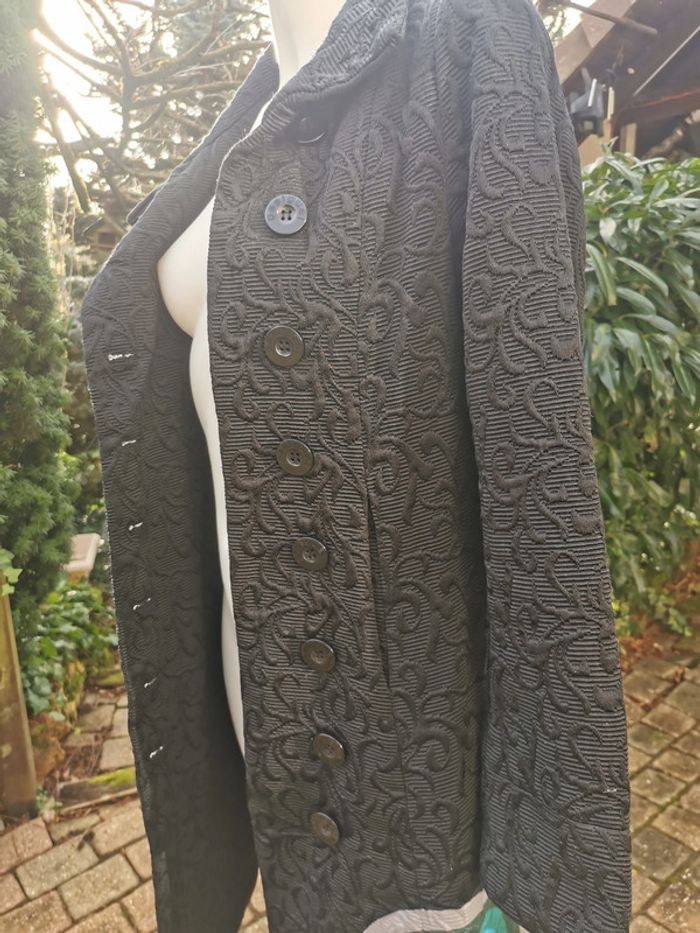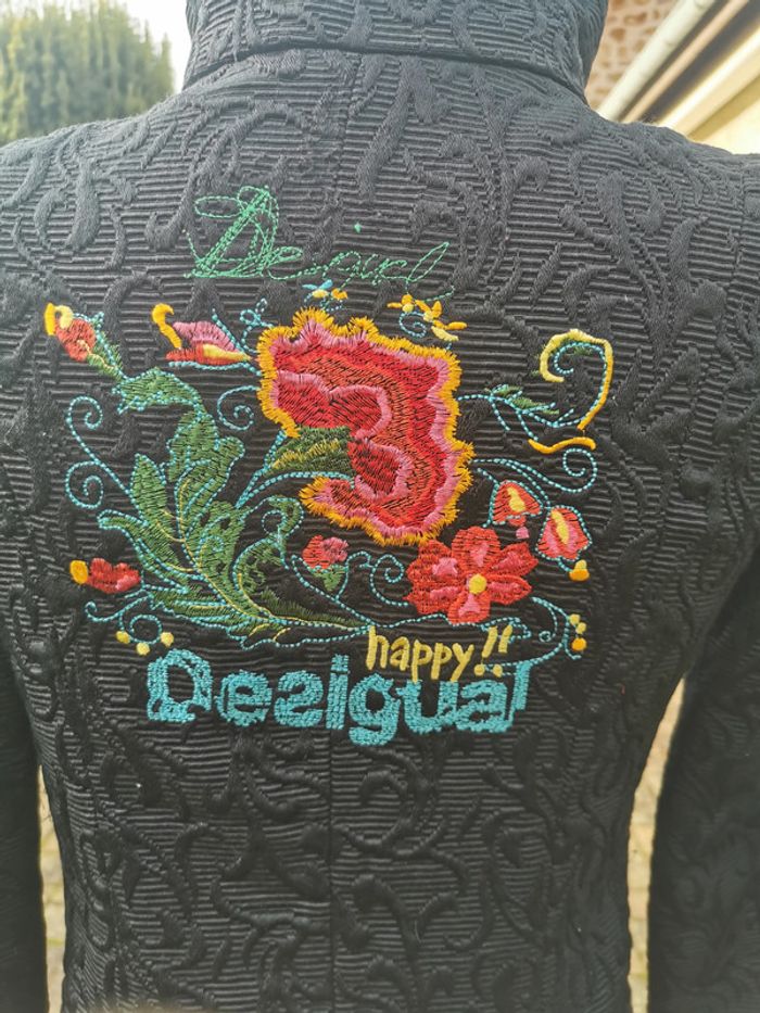 Beau manteau noir en 64% coton et 36% polyester, tissu à relief, la doublure est 100% polyester. Le manteau noir est décoré des autocollants partiellement brodés sur le bas de manteau et au dos la broderie très colorée, le manteau est légèrement évasé, le col montant à boutons, deux poches sur les côtés, taille 38. Le manteau est en très bon état général, présente quelques peluche ou fils sortis. Mesures : Longueur manteau : 92 cm Hauteur col : 10 cm Longueur de manche depuis l'épaule : 62 cm Longueur de manche depuis l'aisselle : 43 cm Largeur de manche : 16 cm Largeur de dos entre les aisselles : 44 cm Largeur des épaules : 37,5 cm Largeur taille : 41 cm Poids : 975g #manteaubrodé #manteaunoir #manteaucolmontant #manteauboutons #manteauevase #manteautaille38