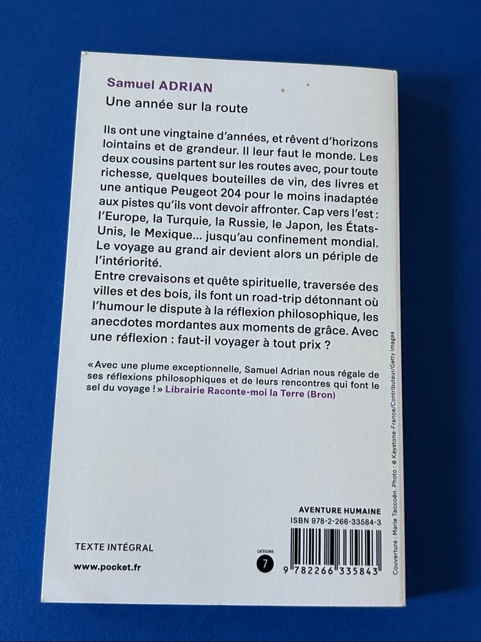 Je vends ce livre en parfait etat Titre : Une année sur la route Auteur : Samuel Adrian Editeur : Pocket Genre : Littérature générale Romans et Récits de voyage Thème : Pays et peuples, Le monde d'aujourd'hui, descriptions et voyages, Monde Format : poche , 252 pages Hauteur : 18 cm Largeur : 11 cm Epaisseur: 1 cm Résumé Une année sur la route Ils ont une vingtaine d'années, et rêvent d'horizons lointains et de grandeur. Il leur faut le monde. Les deux cousins partent sur les routes avec, pour toute richesse, quelques bouteilles de vin, des livres et une antique Peugeot 204 pour le moins inadaptée aux pistes qu'ils vont devoir affronter. Cap vers l'est : l'Europe, la Turquie, la Russie, le Japon, les États-Unis, le Mexique... jusqu'au confinement mondial. Le voyage au grand air devient alors un périple de l'intériorité. Entre crevaisons et quête spirituelle, traversée des villes et des bois, ils font un road-trip détonnant où l'humour le dispute à la réflexion philosophique, les anecdotes mordantes aux moments de grâce. Avec une réflexion : faut-il voyager à tout prix ? Envoi rapide et soigné