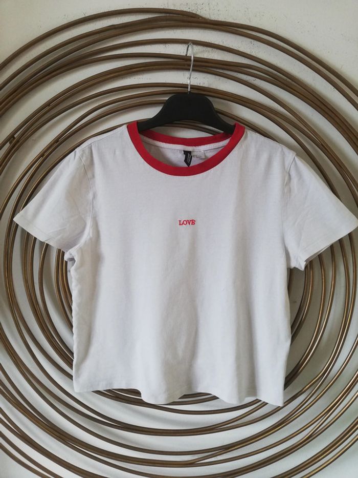 Je vends ce tshirt de la marque Divided (h&m) en bon état. Inscription "love" en rouge Coloris blanc (très légèrement défraichî). Taille S #tshirtdivided #tshirth&m #divided #h&m #tshirtlove