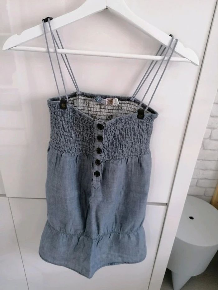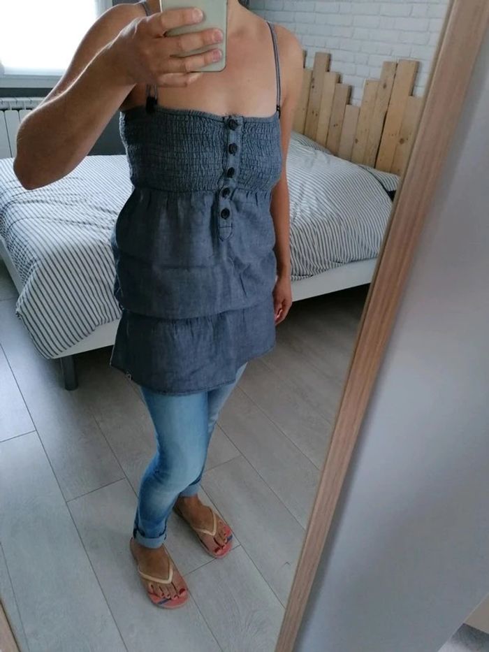 Haut Bershka, Couleur effet jeans, taille S En parfait état Possibilité de mettre une ceinture ou un lien N'hésitez pas à faire un lot #nadmattfemme #nadmattefemmeS #nadmattadofille #bershka #debardeur #ete #plage #piscine
