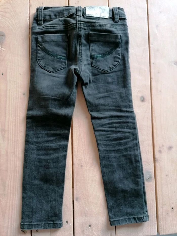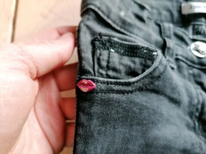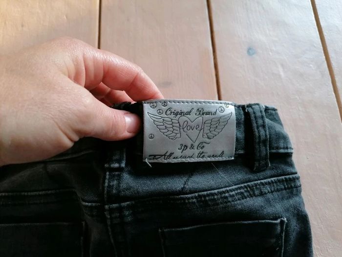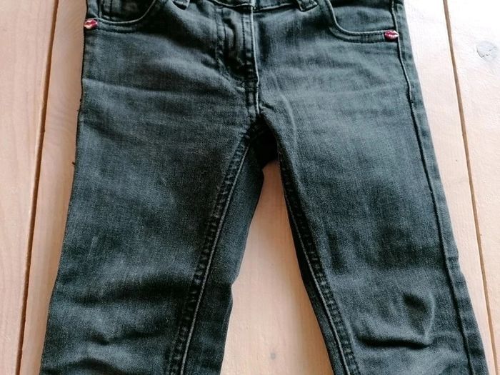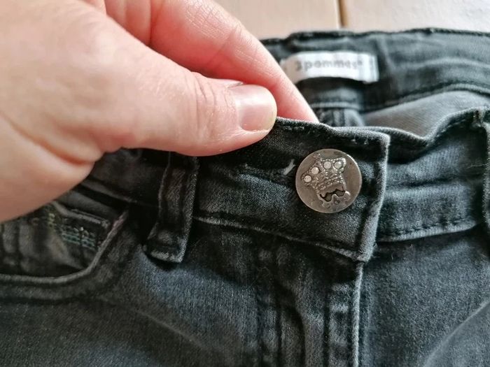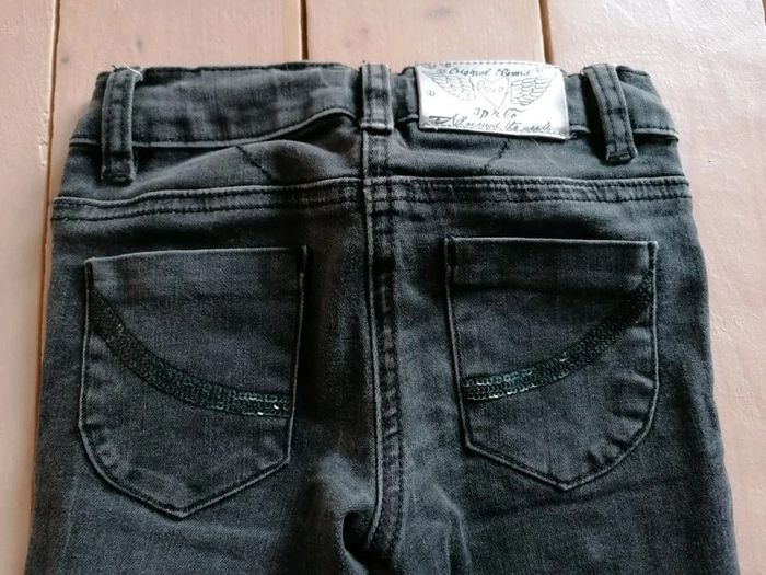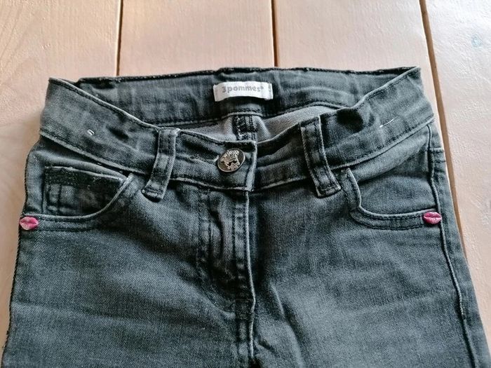 Jeans slim taille 4 ans de la marque 3 pommes. Funky Dark. Couleur gris anthracite. Il est réglable à l'intérieur. 2 petites bouches en métal sur les poches, couleur rose un peu effacé. Sequins noirs sur les poches, étiquette sur l'arrière gris argenté. N'hésitez pas à faire un lot #nadmattquatreansfille #3pommes #jeans #slim #funkydark #fille #quatreans