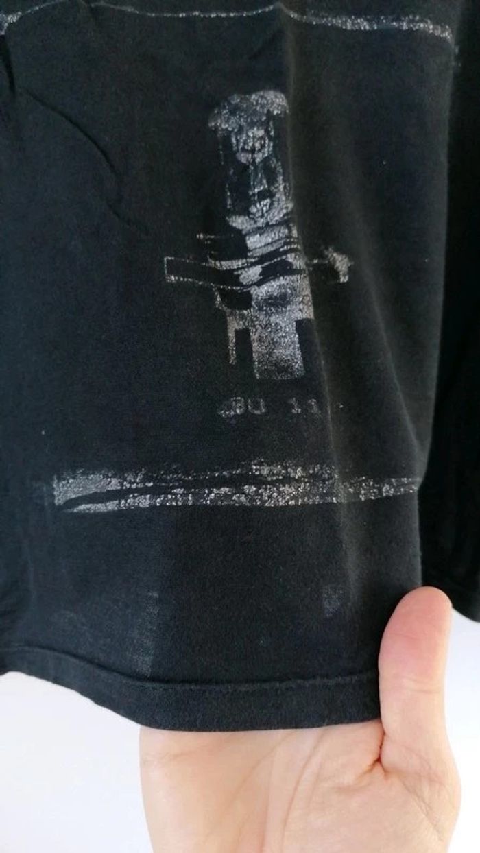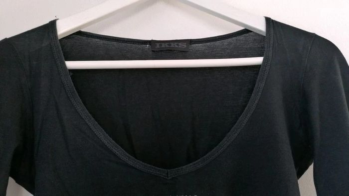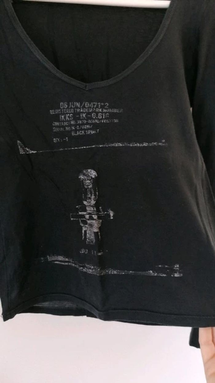 Haut IKKS Matière fine Couleur noire avec inscription argenté En bon état, il y a un micro-trou devant (voir dernière photo) N'hésitez pas à faire un lot #nadmattfemme #nadmattfemmeXS #ikks #haut #rock
