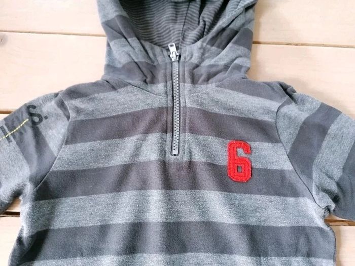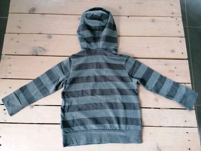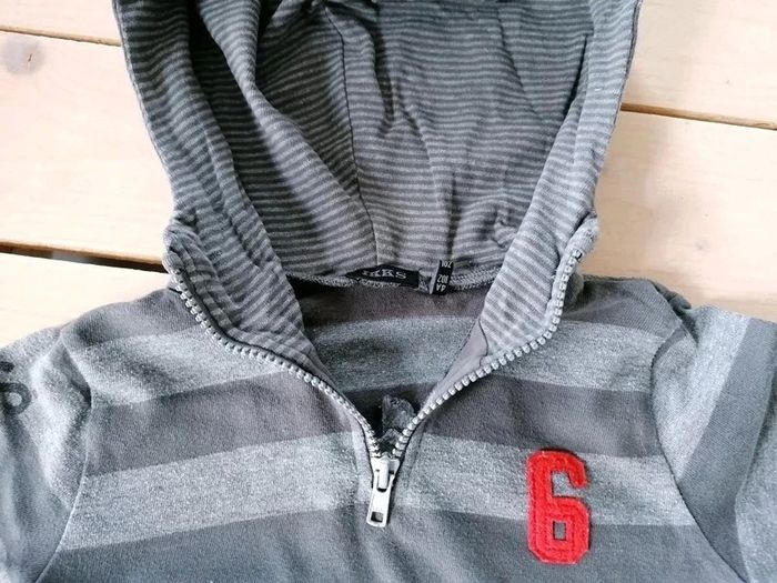Sweat à capuche de la marque IKKS en taille 4 ans (102cm), avec sa capuche, petite fermeture éclair sur le devant, inscription sur une manche très sympa.
