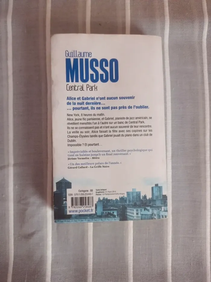 Livre de poche. : Central Park de Guillaume Musso Thriller qui tient terriblement en haleine à la fin renversant 😳 Couverture derrière légèrement tâchée (voir photo) , je l'ai prêté avant d'avoir eu le temps de le recouvrir.. une erreur !