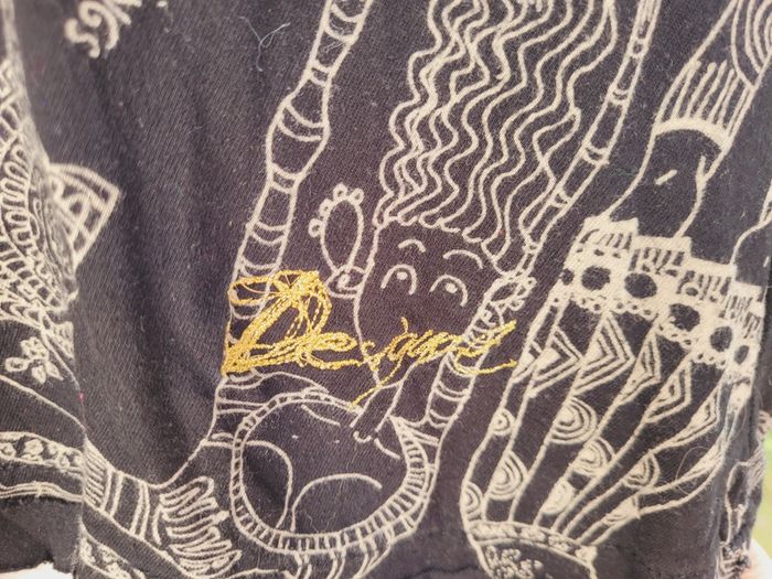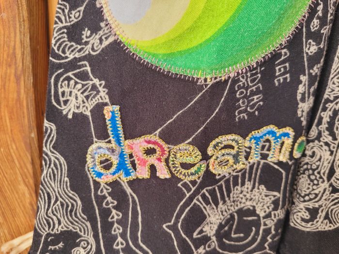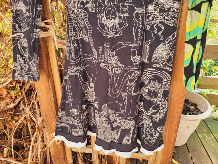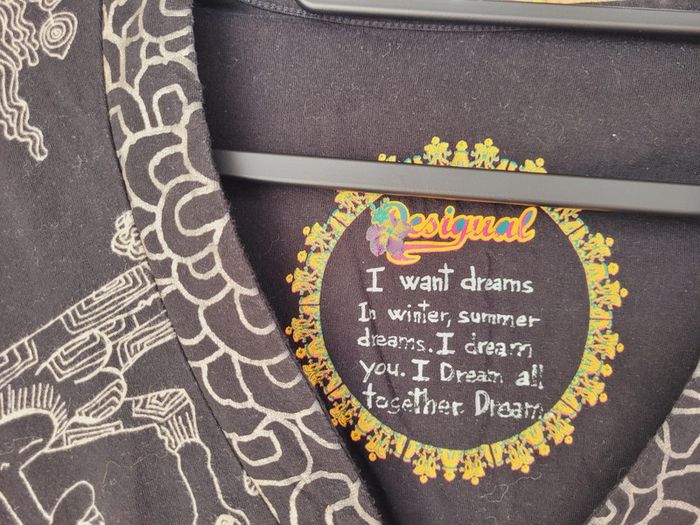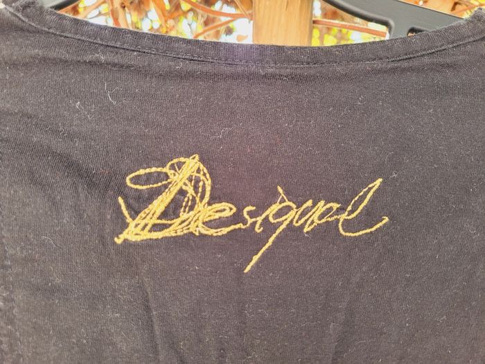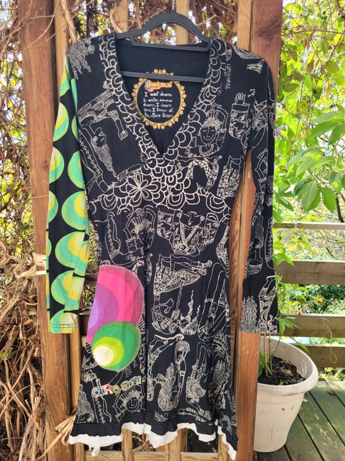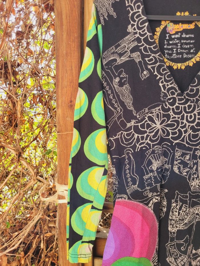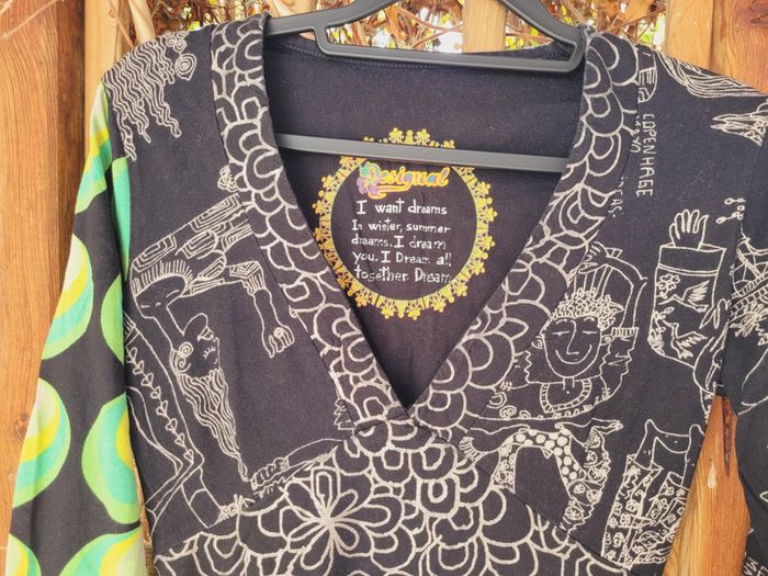 DESIGUAL Robe taille M je dirai un bon 40 car Desigual taille grand Noire à motifs blancs et touches de couleurs vives En très bon état Il n'y a pas l'étiquette Desigual, mais il y a la broderie dans le dos, en bas de la jupe, et l'inscription à l'interieur de la robe #40femmemooglou #tailleMmooglou #desigualmooglou