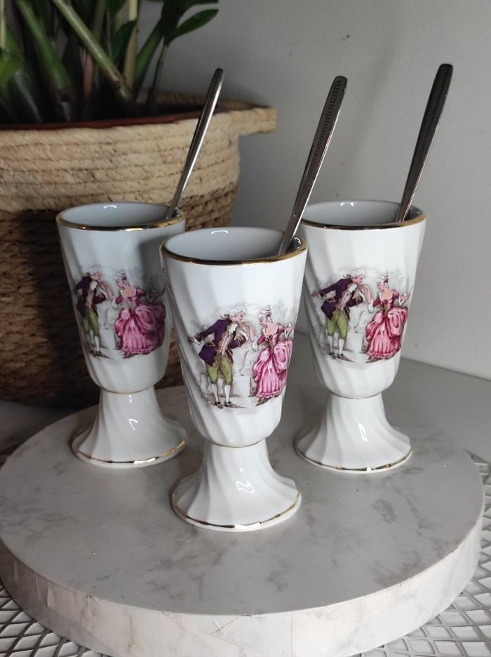 Ensemble de 3 grands mazagrans avec 3 grandes cuillères. Les mazagrans sont en porcelaine de la Compagnie Nationale de Porcelaine (CNP). Les mazagrans portent le même dessin. Ils sont en parfait état tout comme les cuillères. Dimensions : H 14,5 x D 7,5 cm