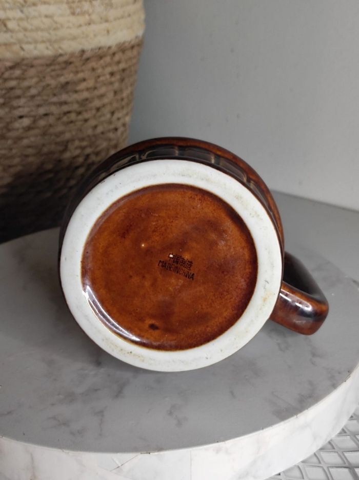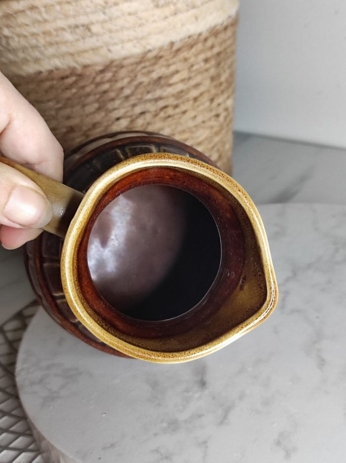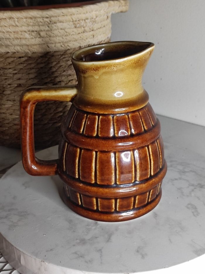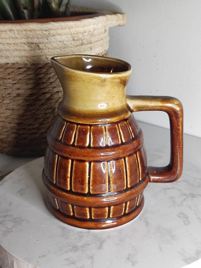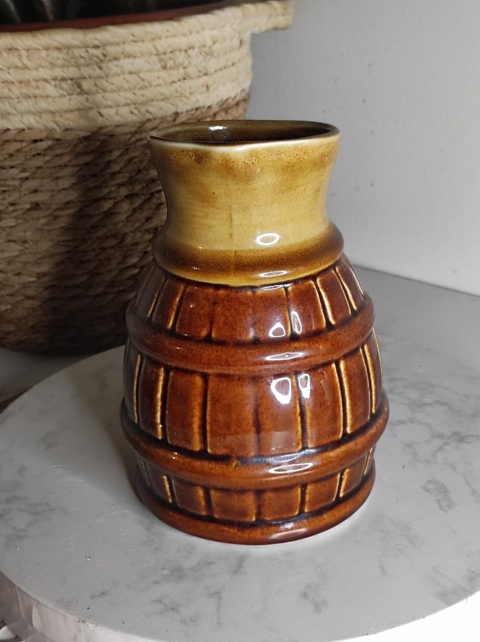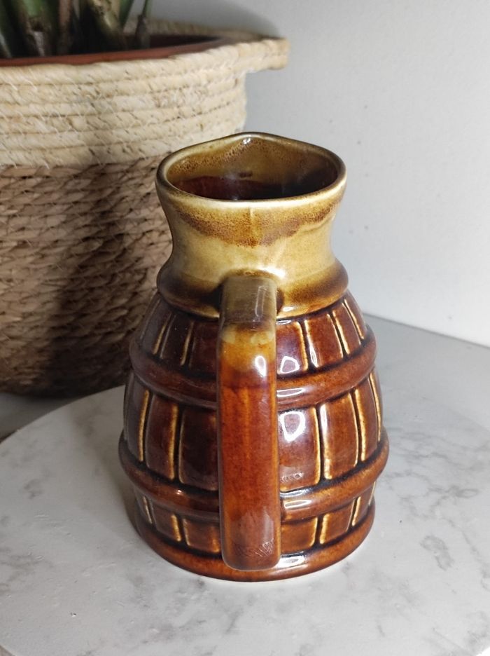 Pichet barrique en céramique vernissée de couleur marron/moutarde. Fabrication chinoise. En parfait état. Dimensions H 16,5 x D 10,5 cm