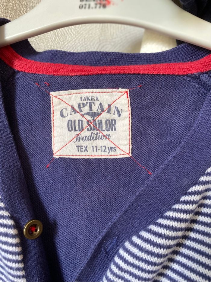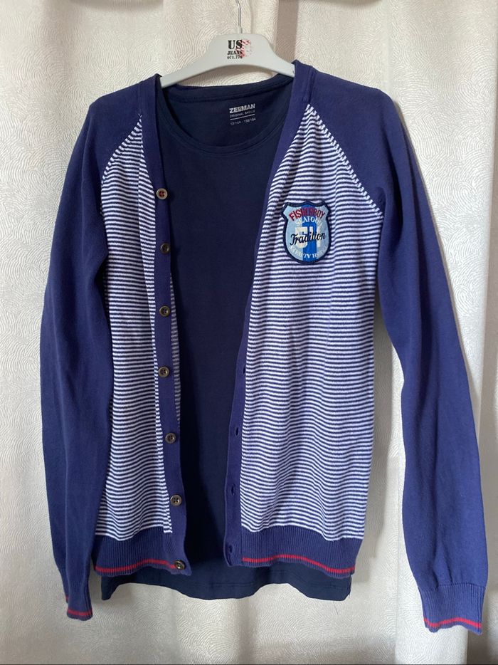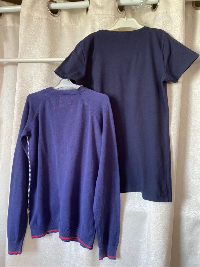 Lot 2 articles Un gilet bleu marine et milleraies Probablement coton, étiquette coupée Taille 11-12 ans Tex Un t-shirt coton bleu marine uni 12-14 ans Zeeman