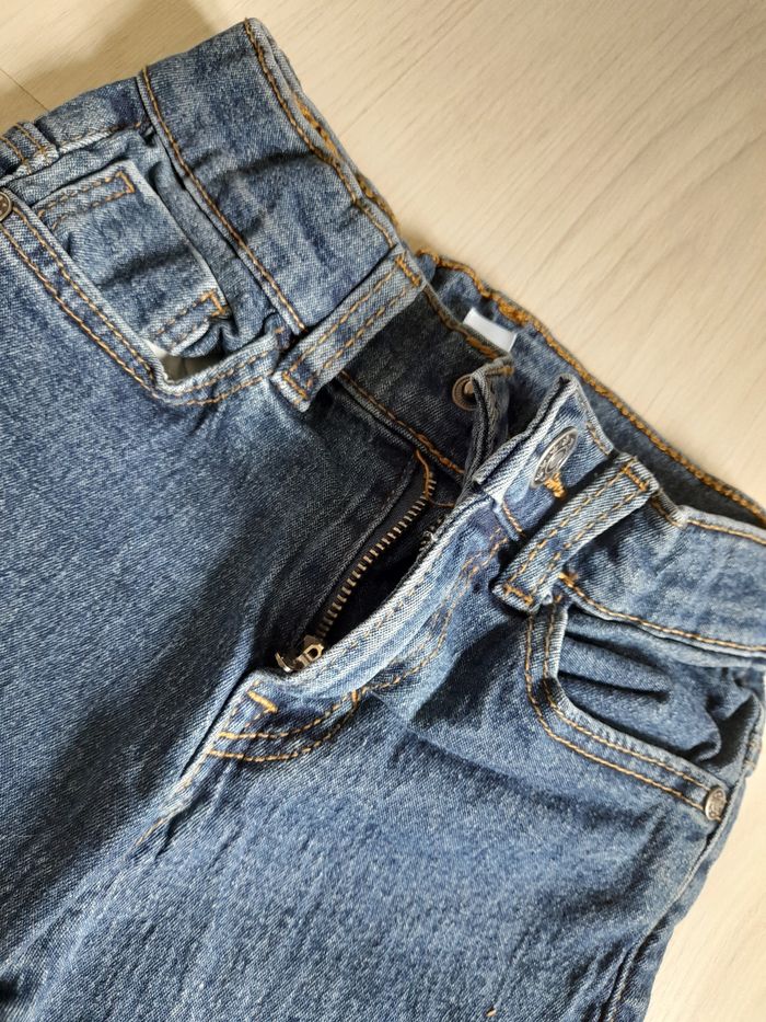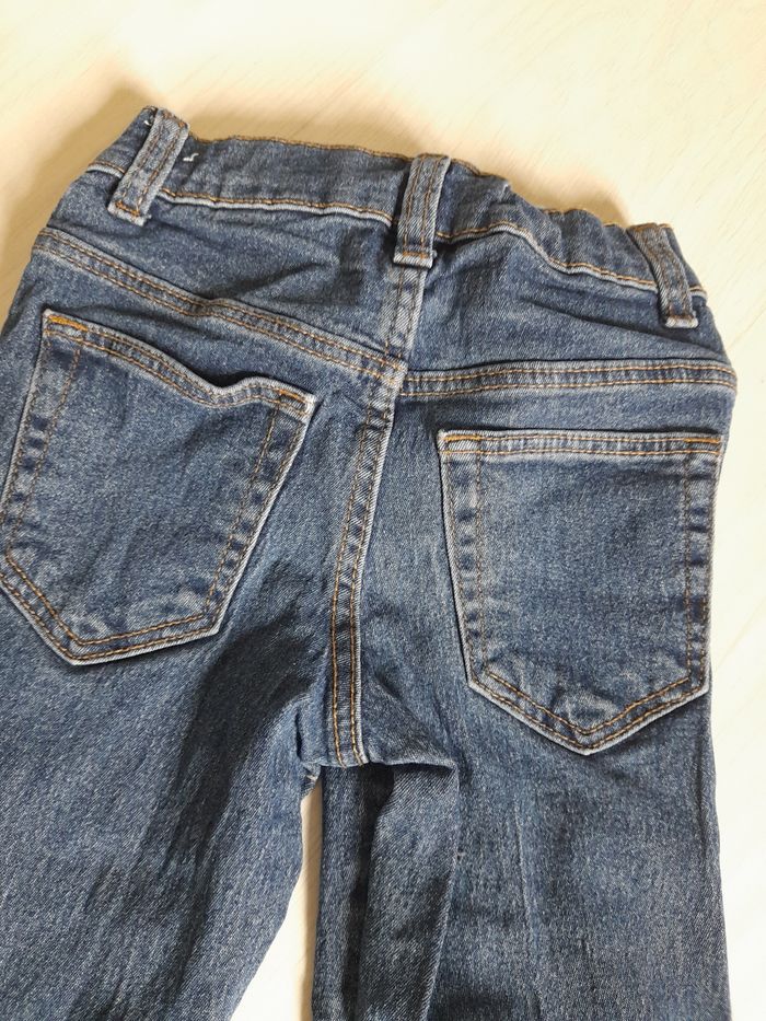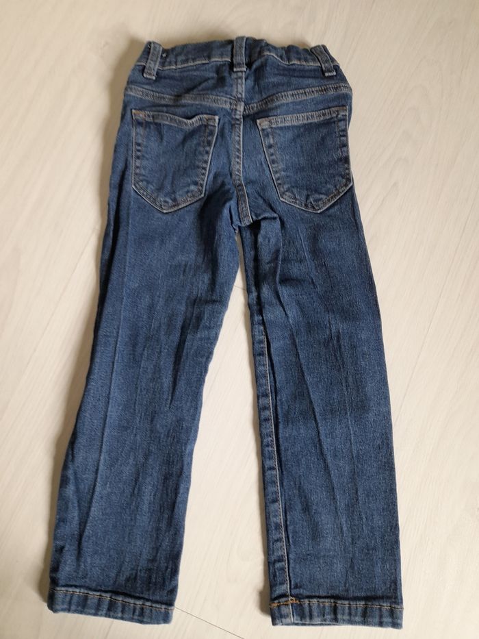 Jeans T 4/5 ans Marque TEX Couleur bleu 3 poches devant 2 poches arrière Attache fermeture éclair et pression Passants pour ceinture 83% coton, 16% Polyester et 1% Elasthane Très très bon état