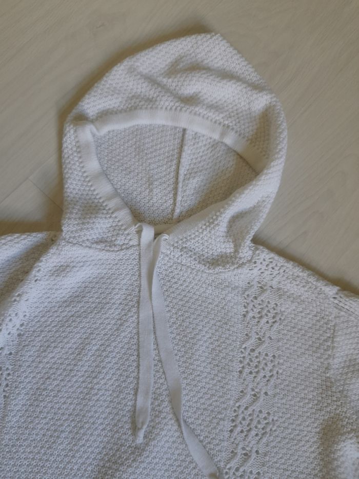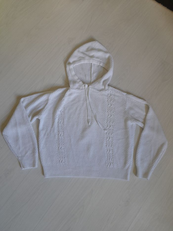 Haut taille S Marque FASHION PRIVATE COMPAGNIE Couleur blanc Avec capuche et cordon 100 % acrylique Très très bon état