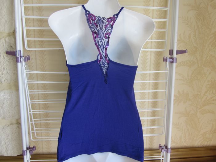 S, haut bretelles, dos dentelle et sequins, pimkie, bleu sur photo mais en fait violet