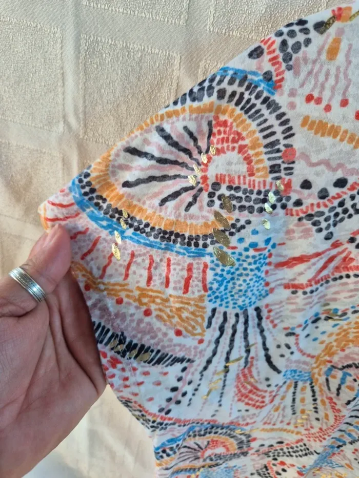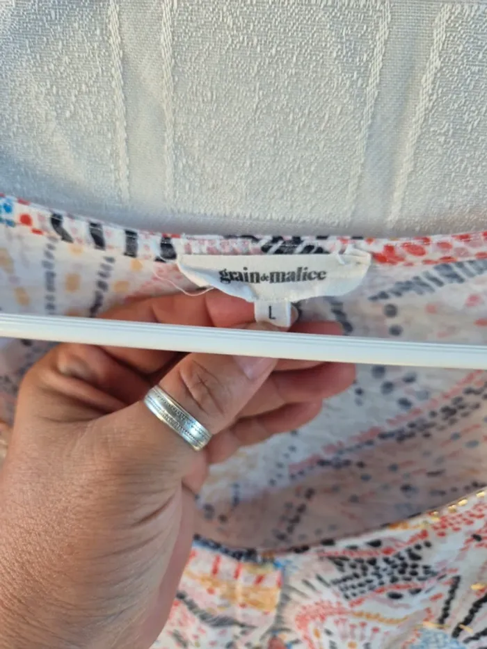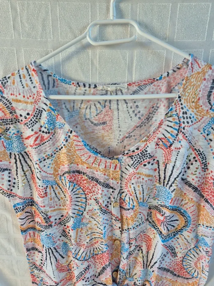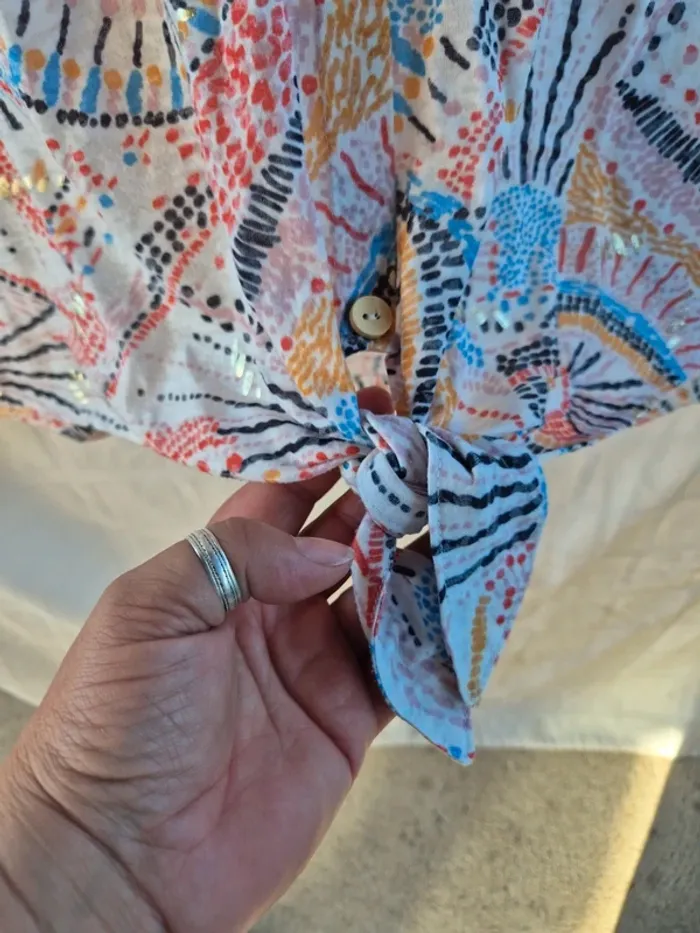 ⬇️mes autres annonces pour femme taille 40👉 #cg89femme40 une blouse ou tshirt avec un petit noeud à nouer, il est magnifique avec ses imprimés et les petites "taches" dorées. Il mesure 51 cm aux aisselles et 60 cm de longueur. très bon état - taille 40 - marque grain de malice #blouse #tshirt #top #graindemalice #chemise