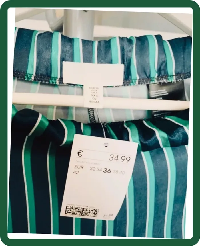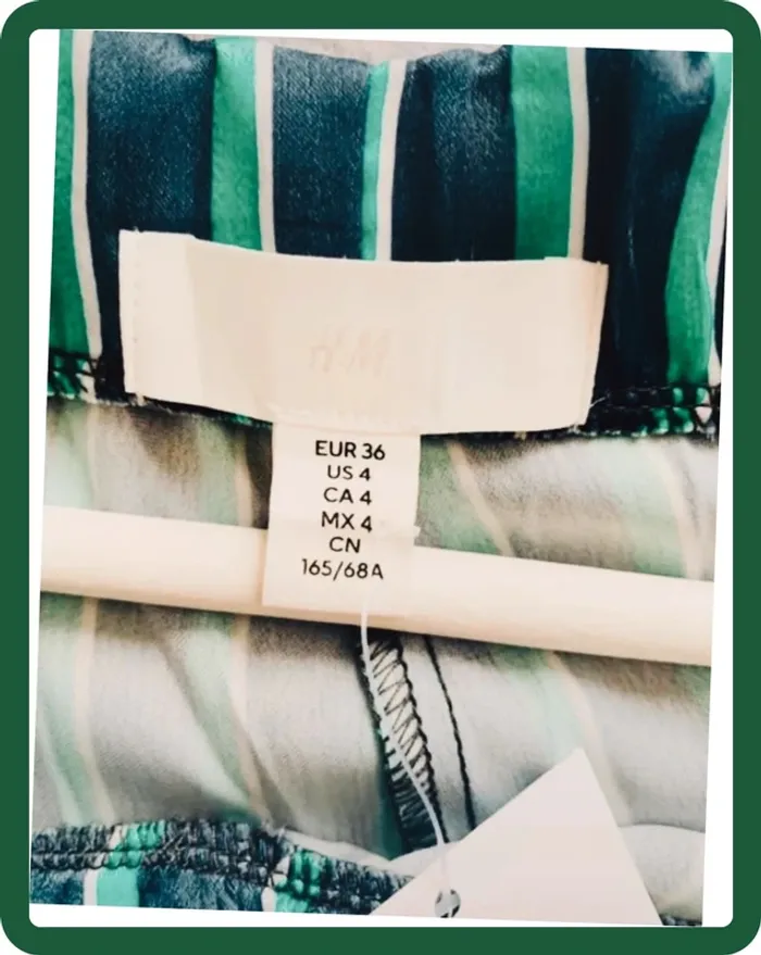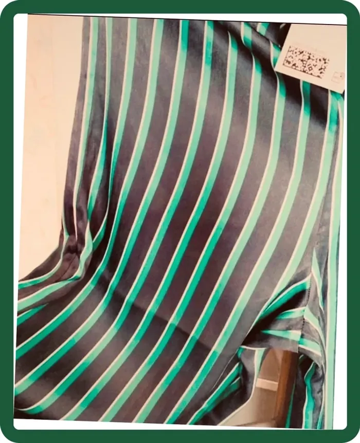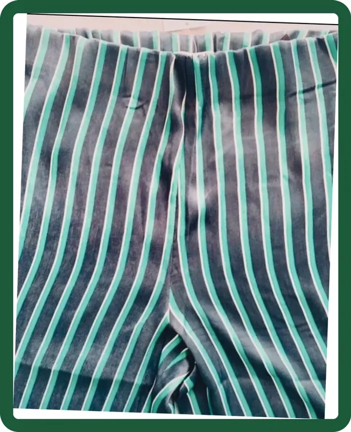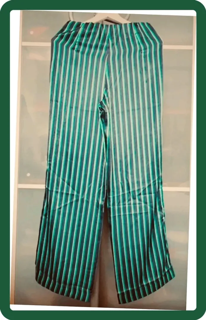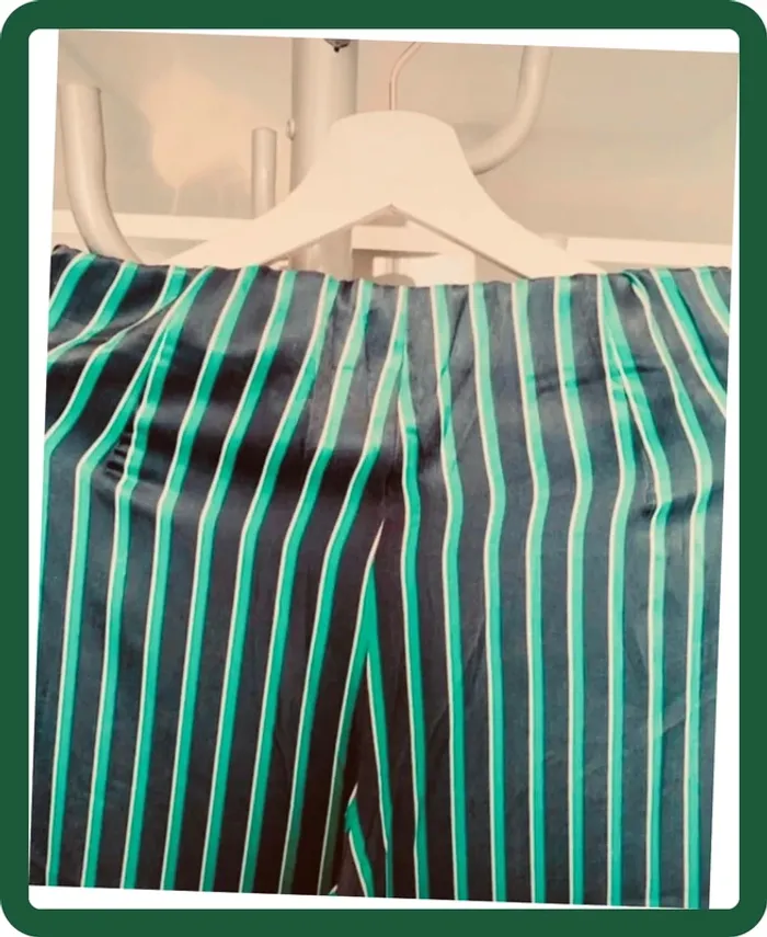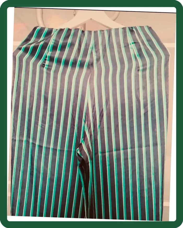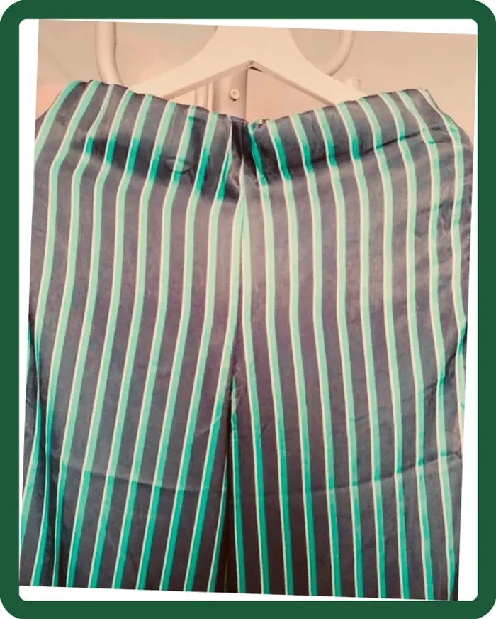 Pantalon en tissu fluide et satiné . Modèle taille haute avec élastique ,habillé . Poches latérales discrètes et larges jambes droites. Fermeture zippée Couleur rayures vertes et bleues indigo Mensurations : -taille :36 cm -entre-jambe: 78cm -longueur : 104cm prix boutique : 34,99€ #okathy2022pantalonfemme #okathy2022femme36 #pantalonété #hmpantalonfemme #pantalonfluide #summer