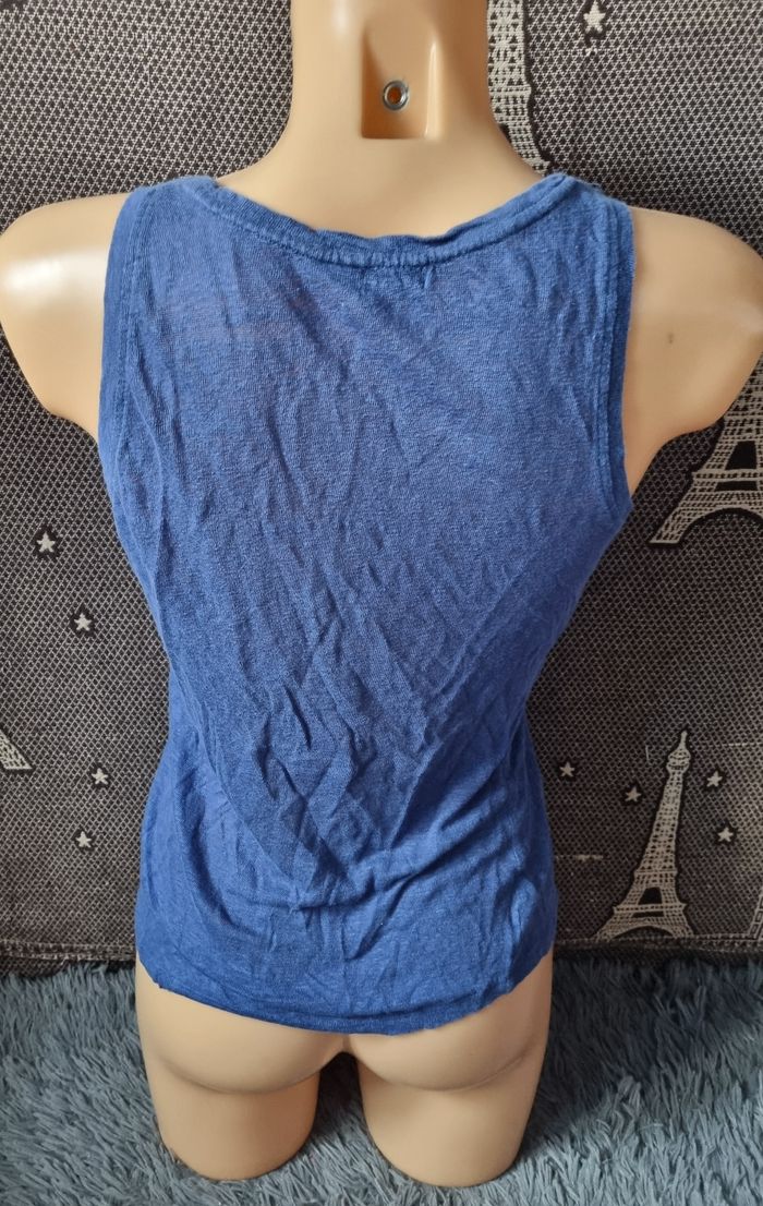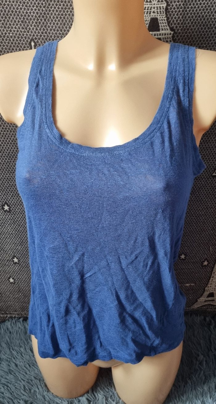 Débardeur bleu ,taille 39-40 marque la redoute, longueur 57cm, largeur 33cm, longueur épaule à aisselle 22cm, largeur aisselle à aisselle 40cm.