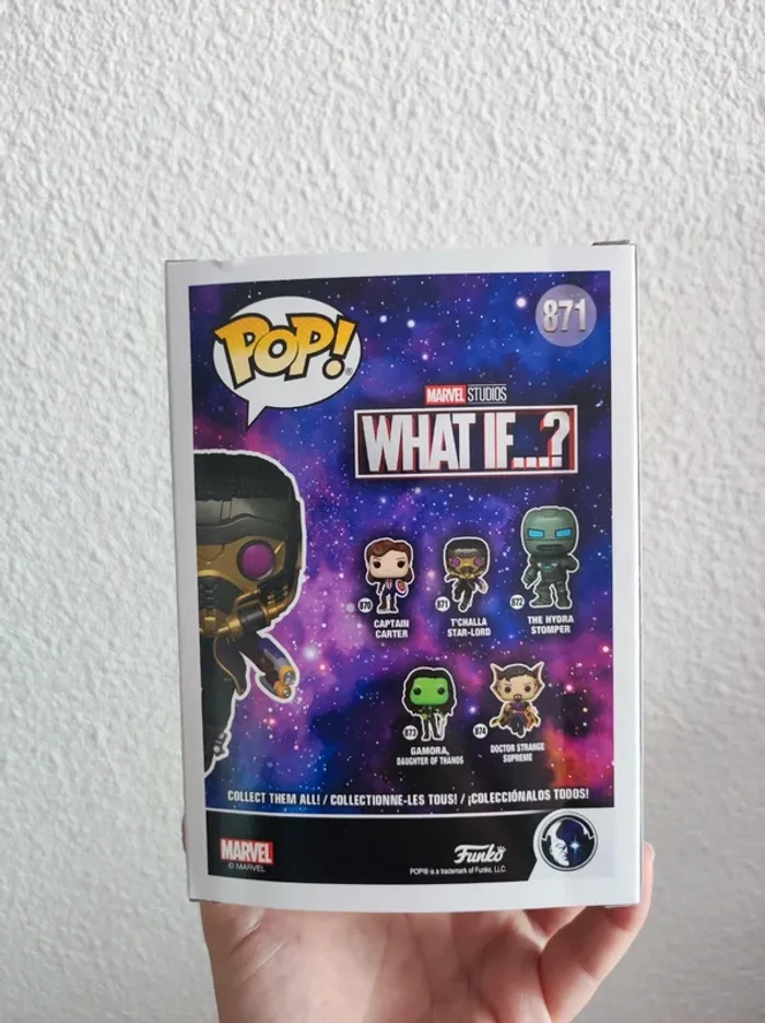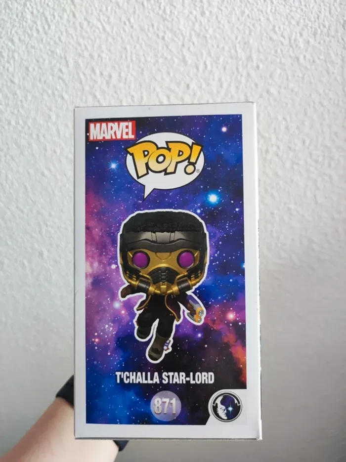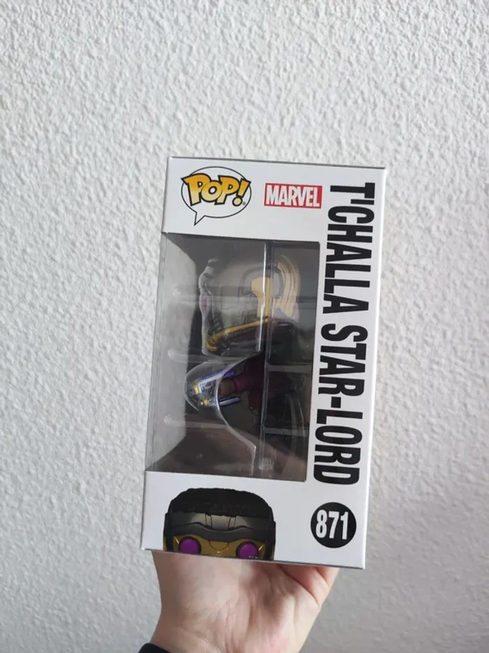 Figurine Funko pop Marvel de T'Challa en Star Lord de la série What if La figurine n'a jamais été sortie de la boîte. Il y a un léger défaut à l'arrière sur le haut de la boîte sinon le reste est clean #funko #funkopop #figurinepop #funkomarvel #marvel #marvelcomics #tchalla #starlord