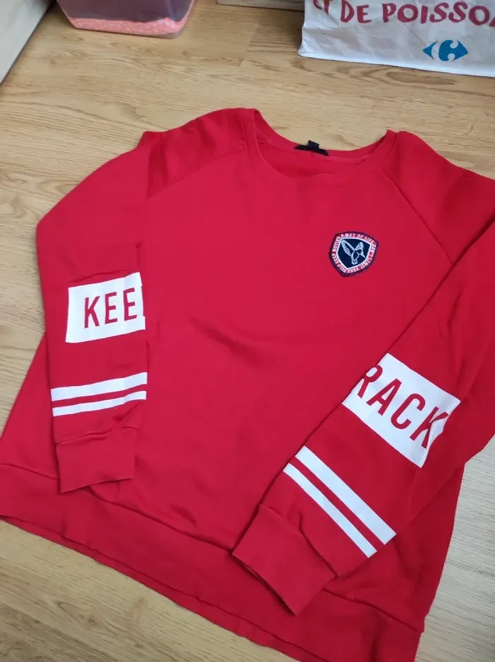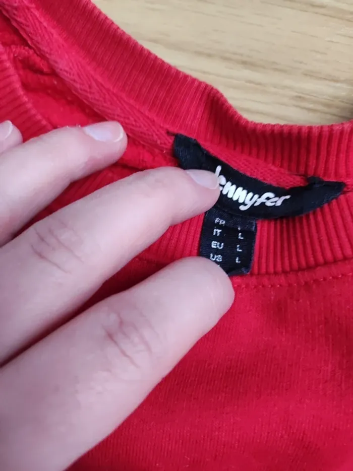 Sweat crewneck femme rouge de chez Jennyfer en très bon état général. Quelques bouloches et le dessin blanc est légèrement craqué. Pas de taches ni de trous Taille L Possibilité de donner les dimensions #sweat #crewneck #pull #femme #jennyfer