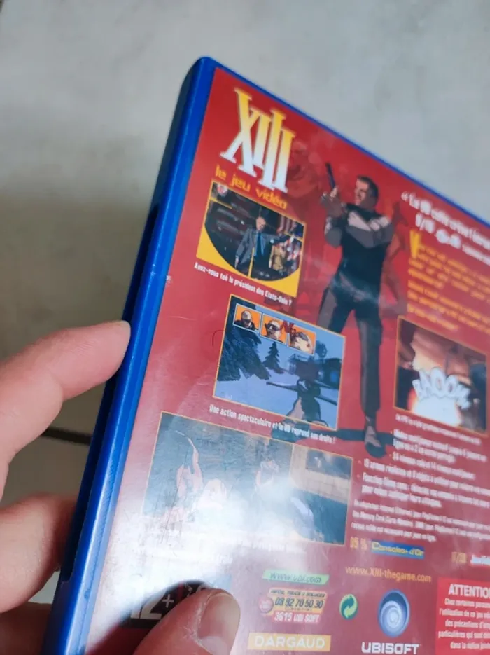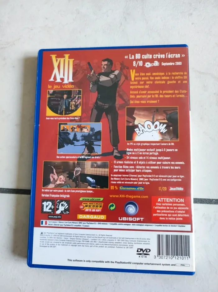 Jeu sur PS2 XIII en bon état. La boîte est légèrement abîmée (voir photo), il y a quelques rayures et petits trous sur le plastique. La notice est présente dans la boîte du jeu. Le CD a quelques traces mais pas de grosses rayures. #jeu #sony #playstation #playstation2 #treize #xiii