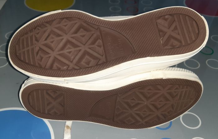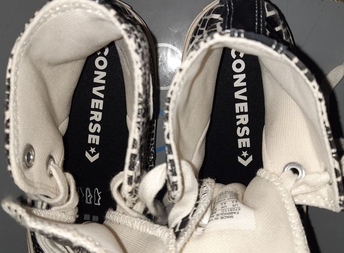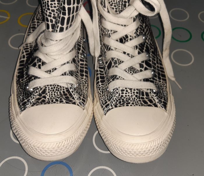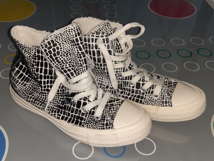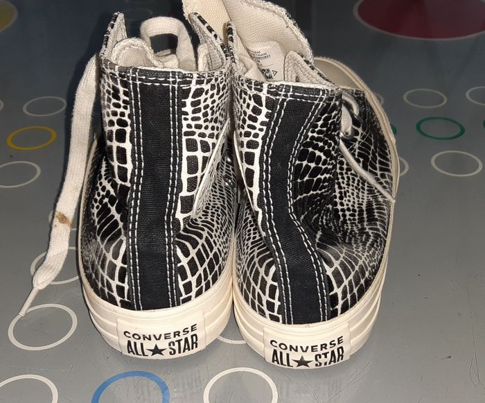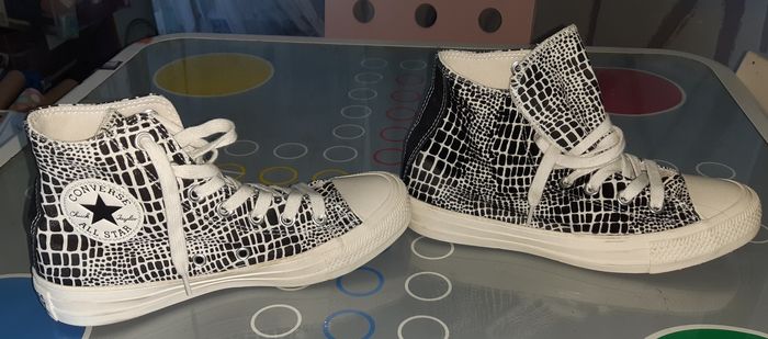 Baskets fille Taille 37 Converse Noir et blanc Un côté de chaque basket, il y a un petit effet velours Une tâche sur un lacet qui partira peut être au lavage (voir photo) Juste essayé neuve