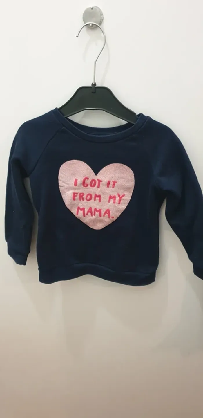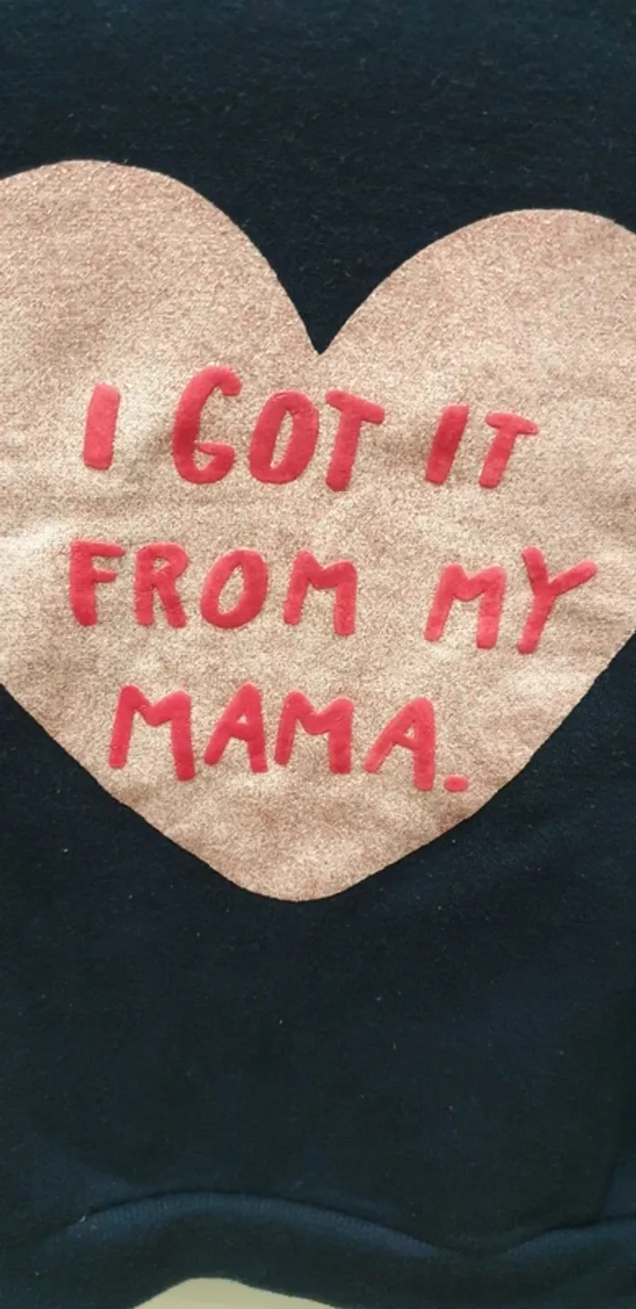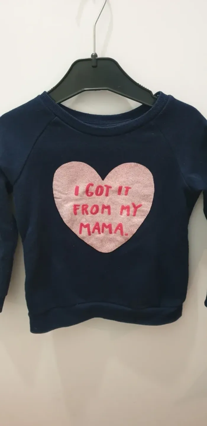 Sweat cœur rose pailletté ▪︎Avec écriture 《I got it from my Mama.》 ▪︎Intérieur doux et polaire (voir dernière photo) ▪︎Comme vous pouvez le voir sur les photos le dessin n'est pas du tout abîmé ▪︎Taille 24-36 mois (98cm)