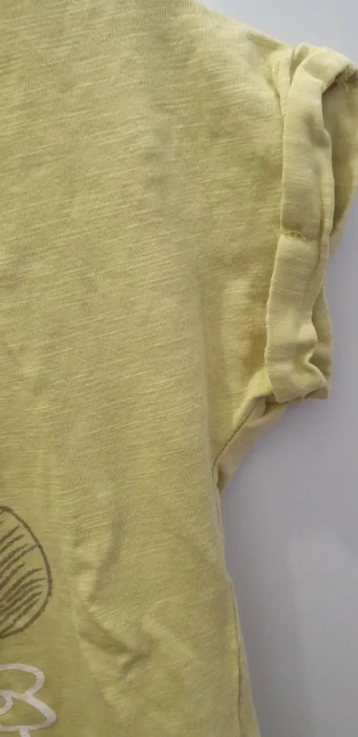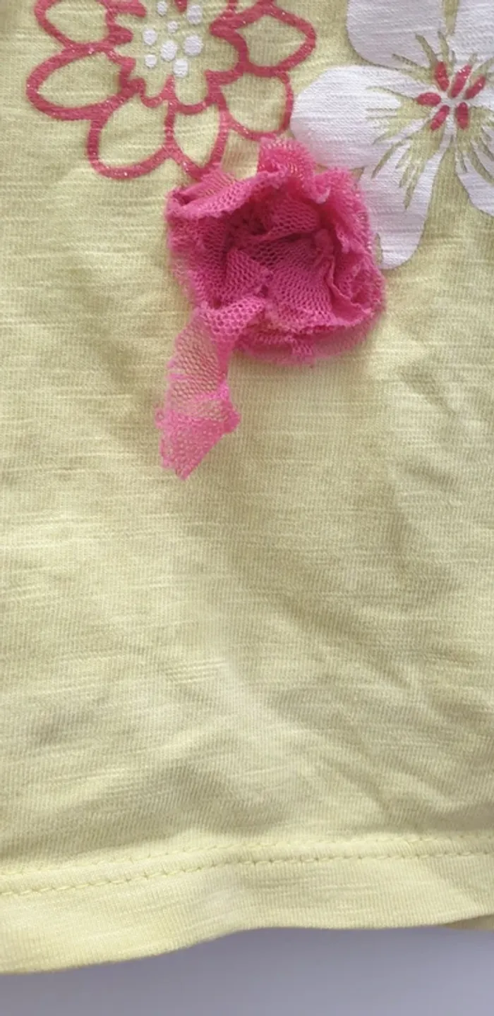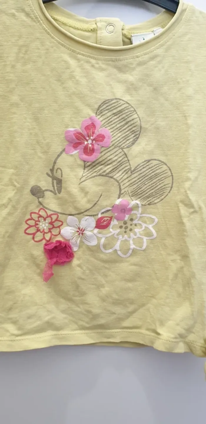 Tshirt Minnie Motif Minnie et fleurs Petit noeud en bas du t-shirt Fleur en tulle un peu cassée 3 boutons pressions a l'arrière Taille 23 mois 86cm 95% coton 5% elasthane