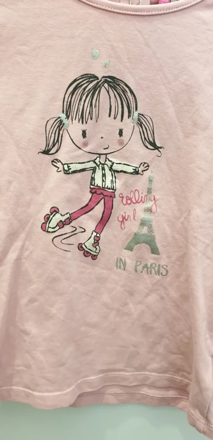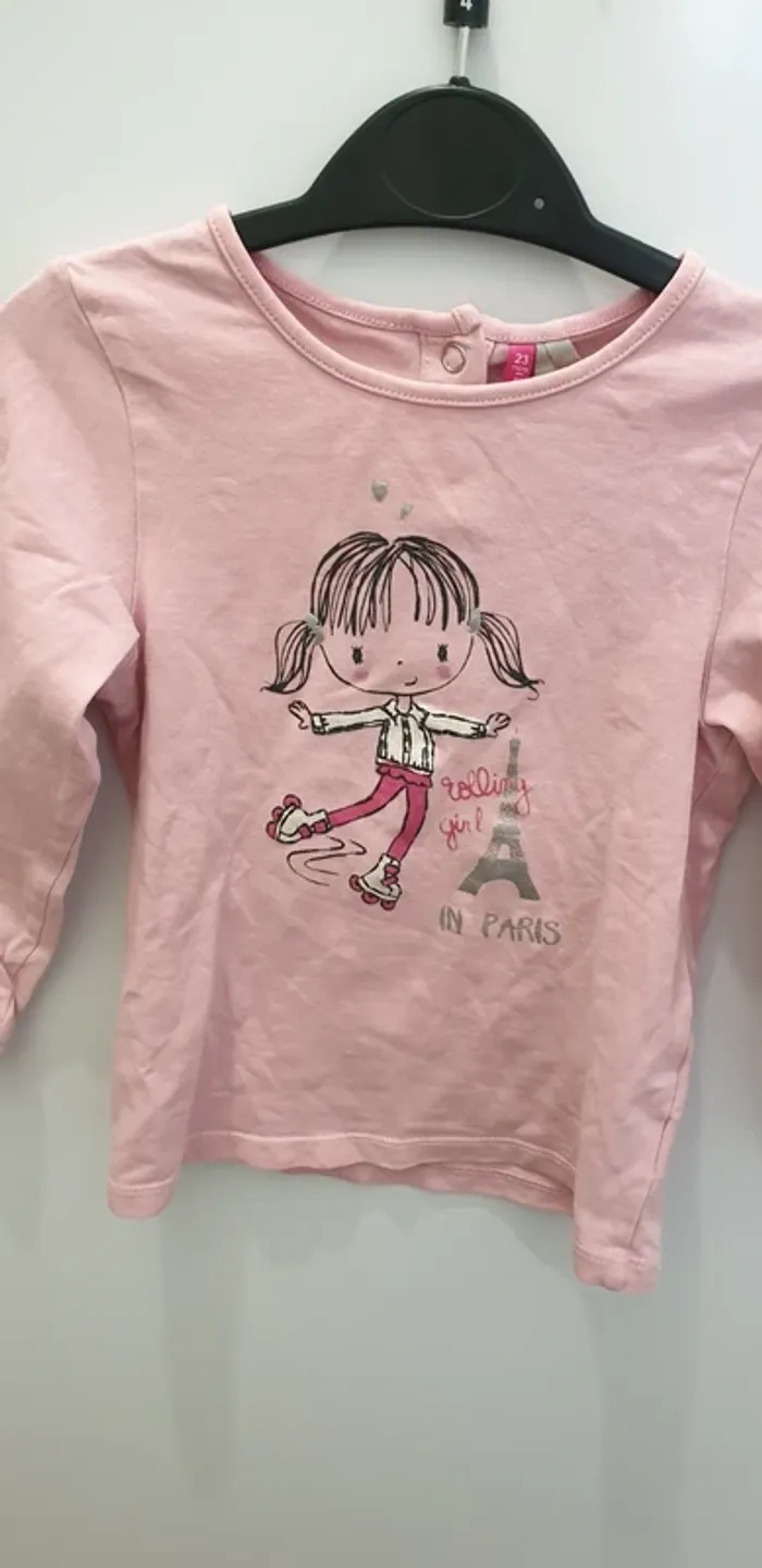 T-shirt manches longues Motif fillette en rollers et Tour Eiffel, avec écrit " rolling girl in Paris " 3 boutons pressions a l'arrière 95% coton 5% elasthane Taille 23 mois 86cm Marque Orchestra