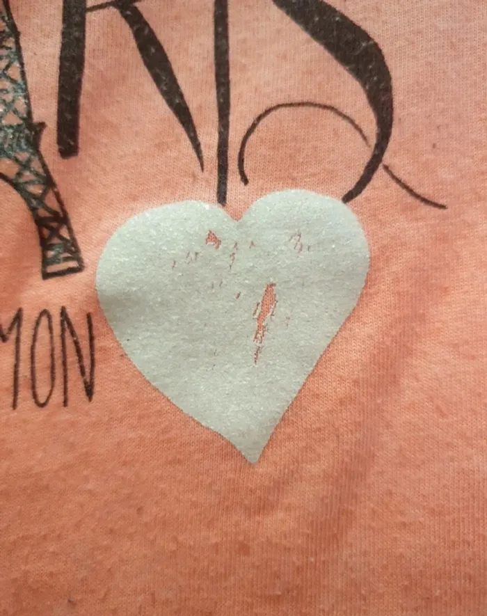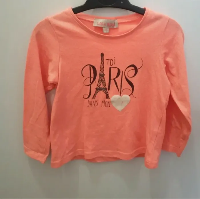 T-shirt manches longues Dessin tour eiffel avec écrit " toi Paris dans mon ♡ " Intérieur du cœur un peu usé ( voir dernière photo ) 66,8% polyester 33,2% coton Taille 2 ans 86cm