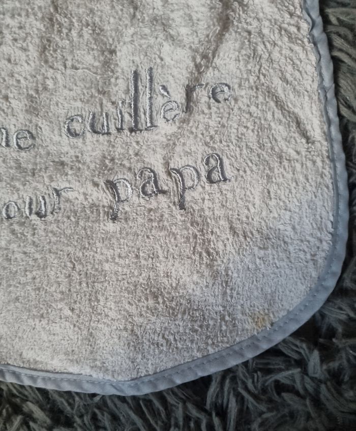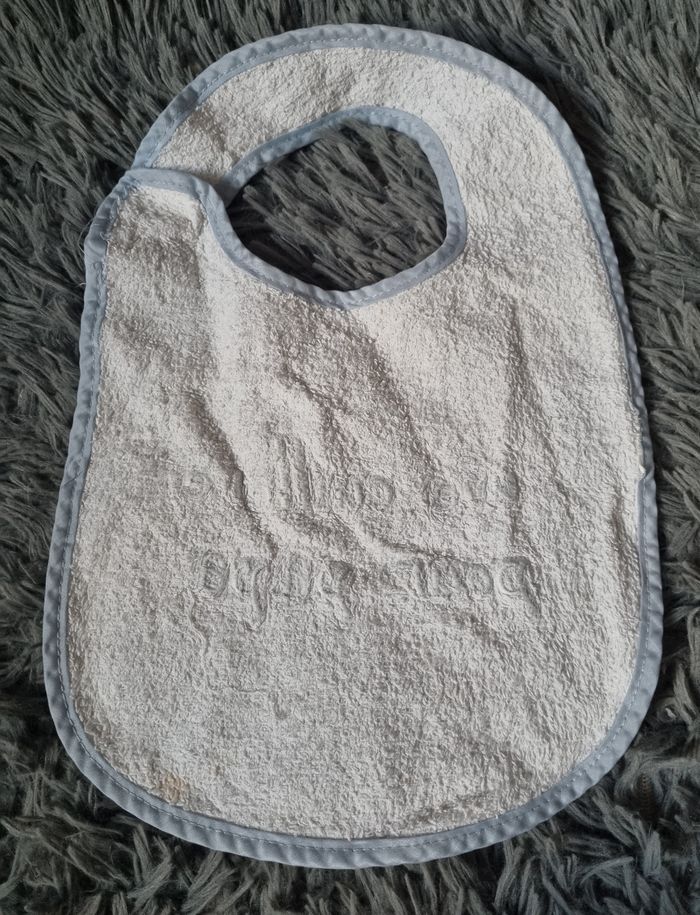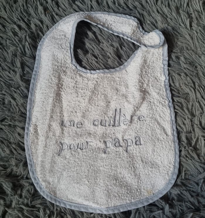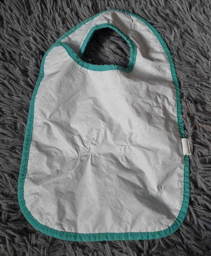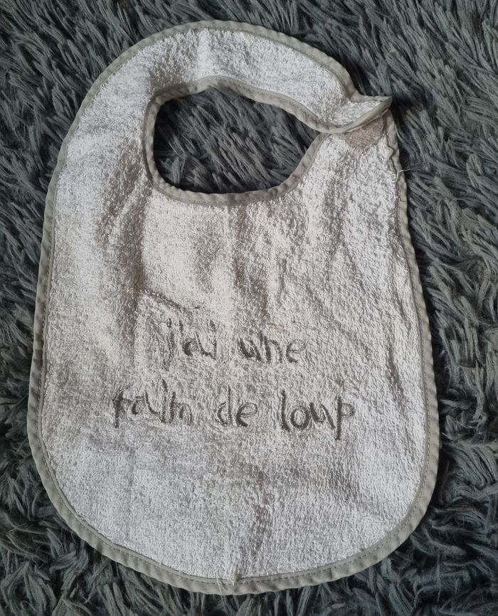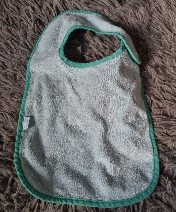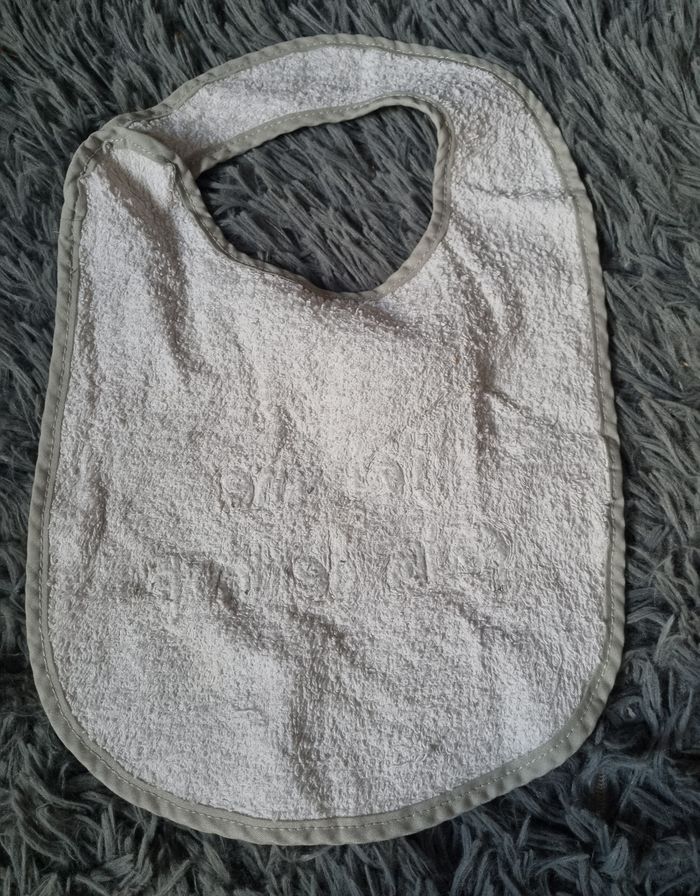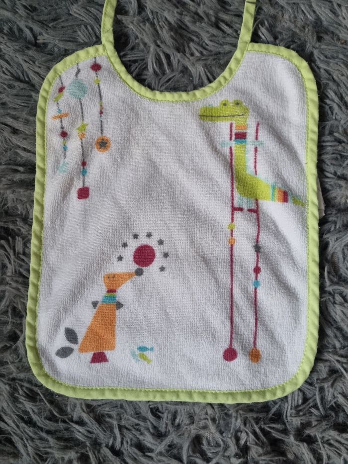 Lot 5 bavoirs, 3 à scratch, un a enfiler et un à cordon celui-ci est en très bonne état peu servie.