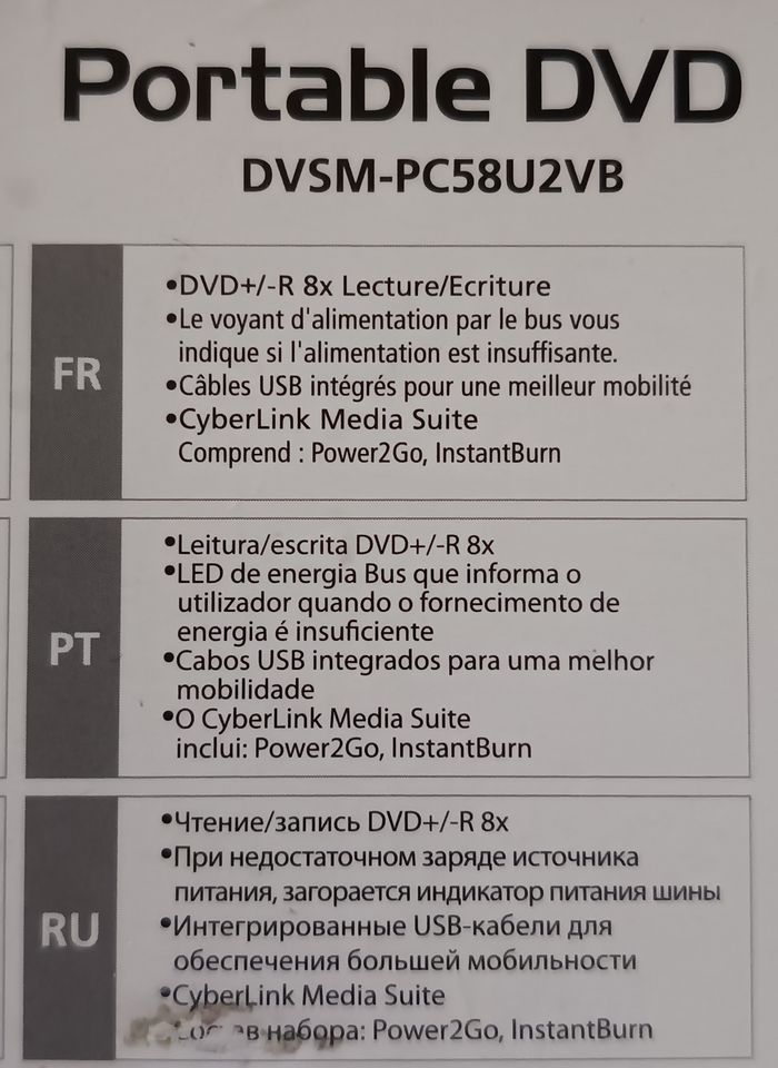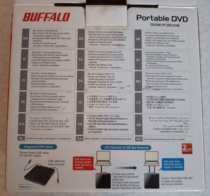 Le Buffalo DVSM-PC58U2V est un lecteur/graveur de DVD externe dédié aux utilisateurs de netbooks et autres ultraportables. Peu encombrant, il fonctionne grâce à deux ports USB et peut graver les galettes à une vitesse maximale de 24x pour les CD et 8x pour les DVD. 2 Types câbles USB intégrés : l'un à la connexion PC/Mac L'autre permet d'alimenter le lecteur en mode boost si l'alimentation USB du PC/Mac est insuffisant un connecteur permettant également de le charger indépendamment DC-In 5V (chargeur standard non fourni) (voir dernière photo) Logiciels fournis: Cyber Link Média Suite Instant Burn Power2Go Notice incluse