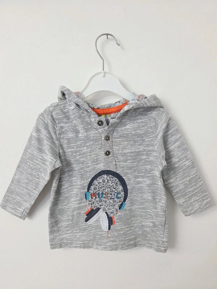 Joli T-shirt gris, marque Orchestra, taille 6 mois. A capuche et manches longues. Pour limiter les frais pensez à faire un lot en suivant le lien (Bien enlever vos filtres avant): #luckyckygarcon6mois