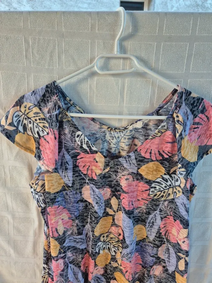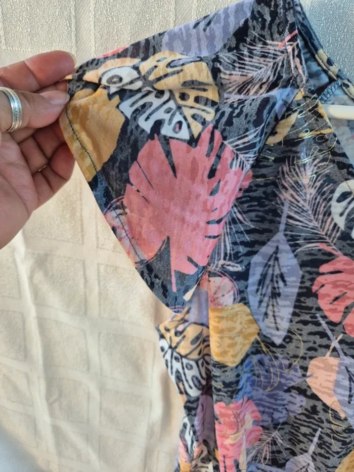 ⬇️mes autres annonces pour femme taille 40👉 #cg89femme40 un tshirt avec imprimé feuille. Un beau col "V" devant et un volant aux épaules, il est élastiqué sur la base (voir photo). Il mesure 52 cm aux aisselles et 63 cm de longueur. très bon état - taille 40 - marque grain de malice #tshirt #top #imprimé #colv #graindemalice