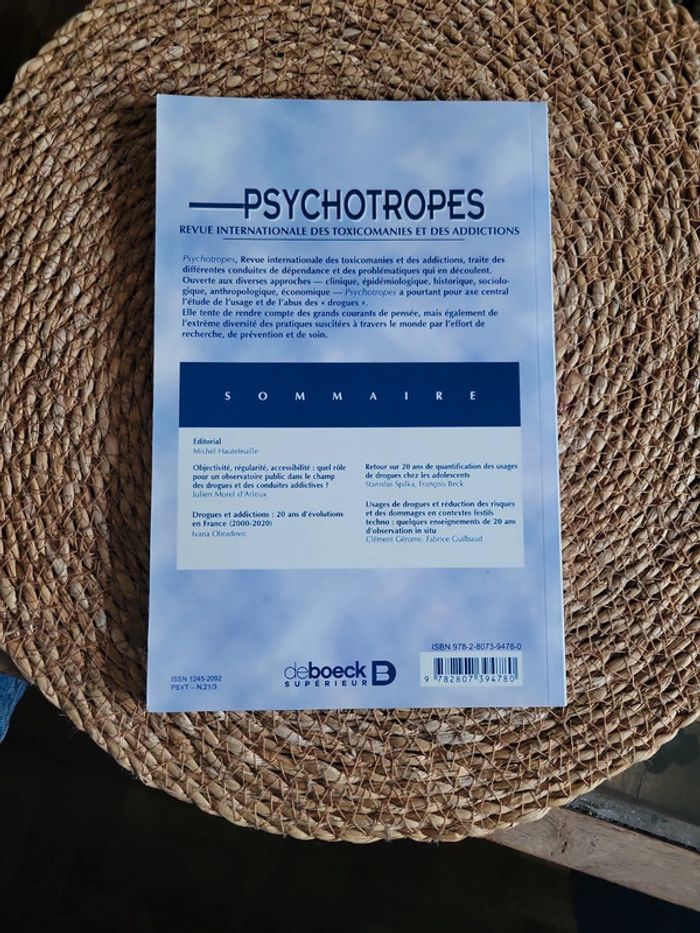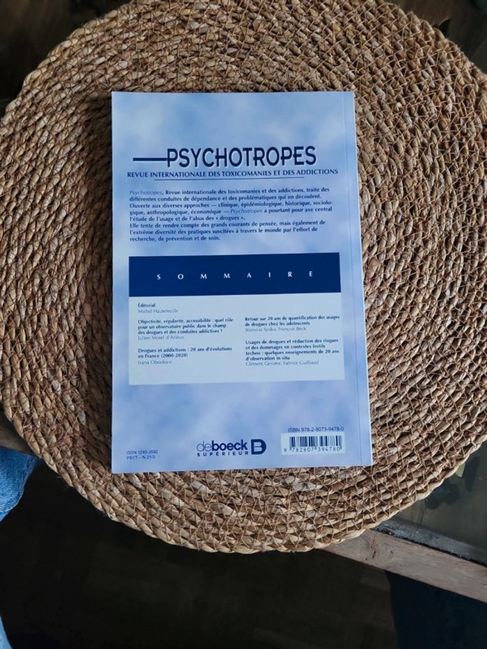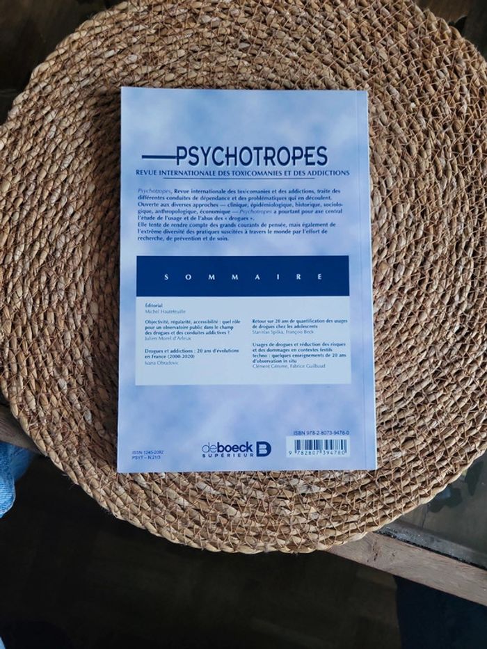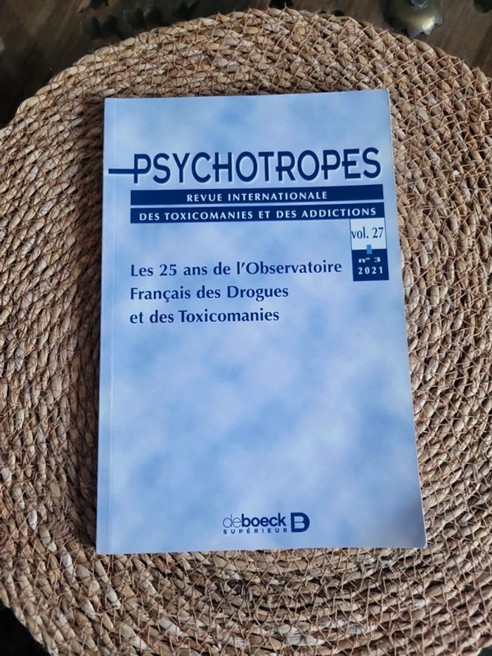 Revue internationale des toxicomanies et des addictions. Psychotropes, revue internationale des toxicomanies, traite des substances psychotropes, de leurs usages et des dépendances qui en découlent. Ouverte aux diverses approches concernant les dépendances – clinique, épidémiologique, historique, sociologique, anthropologique, économique - Psychotropes a pourtant pour axe central l’étude de l’usage et de l’abus des « drogues ». Elle rend compte des grands courants de pensée mais également de l’extrême diversité des pratiques suscitées à travers le monde par l’effort de recherche, de prévention et de soin. Il s’agit d’une revue à comité de lecture « peer reviewed ». Tres bon état. Lot possible sur demande avec divers articles de mon dressing. Envoi sous 24h_48h