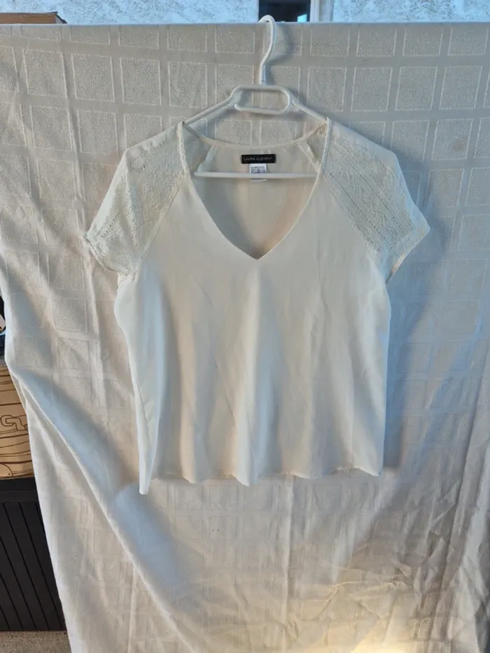 ⬇️mes autres annonces pour femme taille 38👉 #cg89femme38 une blouse blanc avec dentelle aux épaules. il mesure 51 cm aux aisselles et 62 cm de longueur. très bon état - taille 38 - marque laura clement de la redoute #blouse #dentelle #redoute #lauraclement
