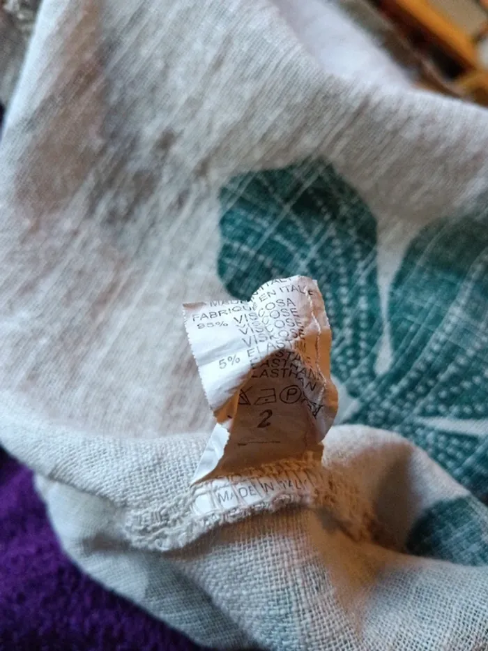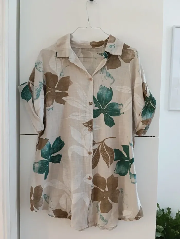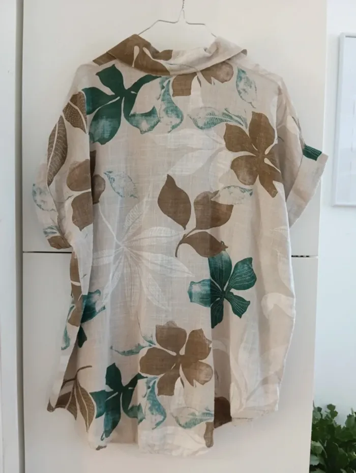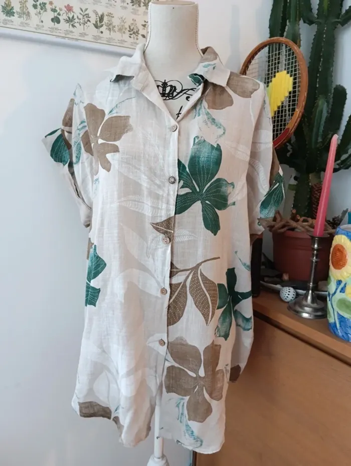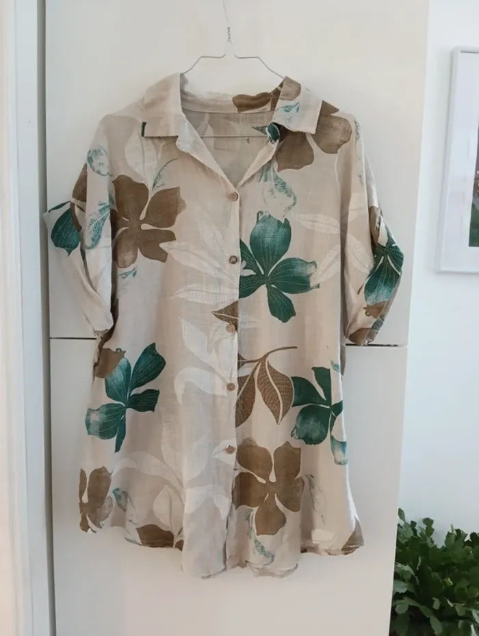 Chemise longue Made in Italy Viscose Fond écru,fleurs verte et marron Taille 42 estimée à confirmer avec les mesures Peut convenir à plusieurs tailles selon l'effet souhaité. Aisselles 63cm Longueur 75cm
