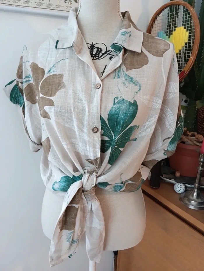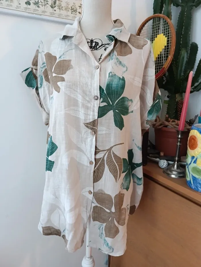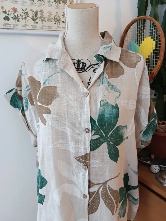 Chemise longue écrue  fleurs vertes et marron - photo numéro 1
