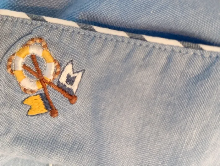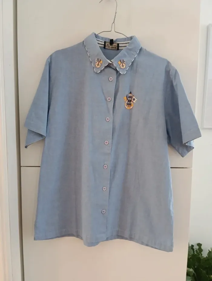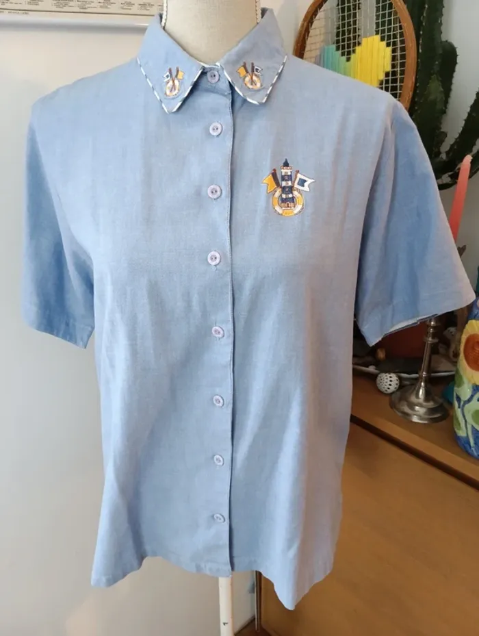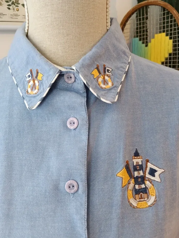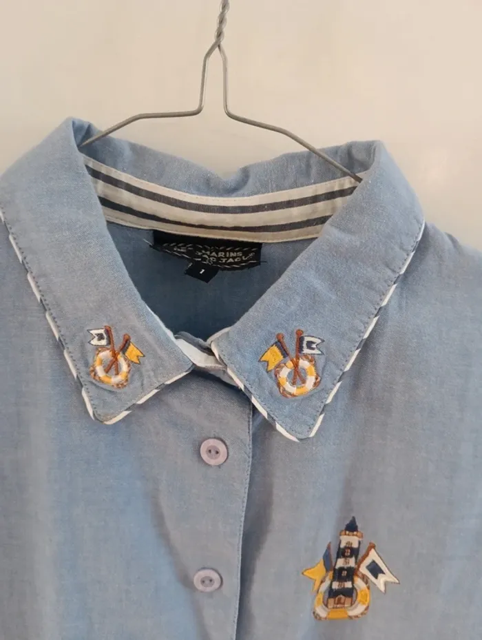 Chemisez en coton vintage bleu les marins de Jac Jac taille 1 Broderies col thème marin Taille 38 estimée à confirmer avec les mesures selon l'effet souhaité. Mesures Epaules 41cm Aisselles 52cm Longueur 75cm