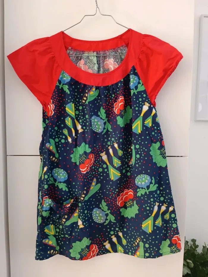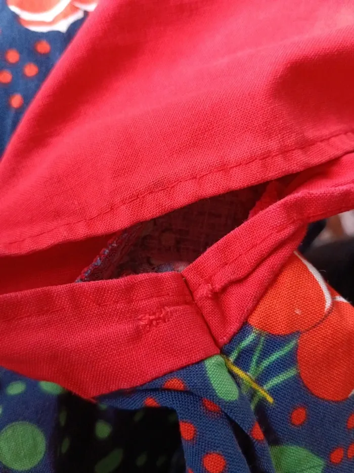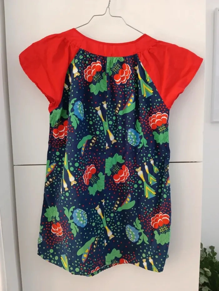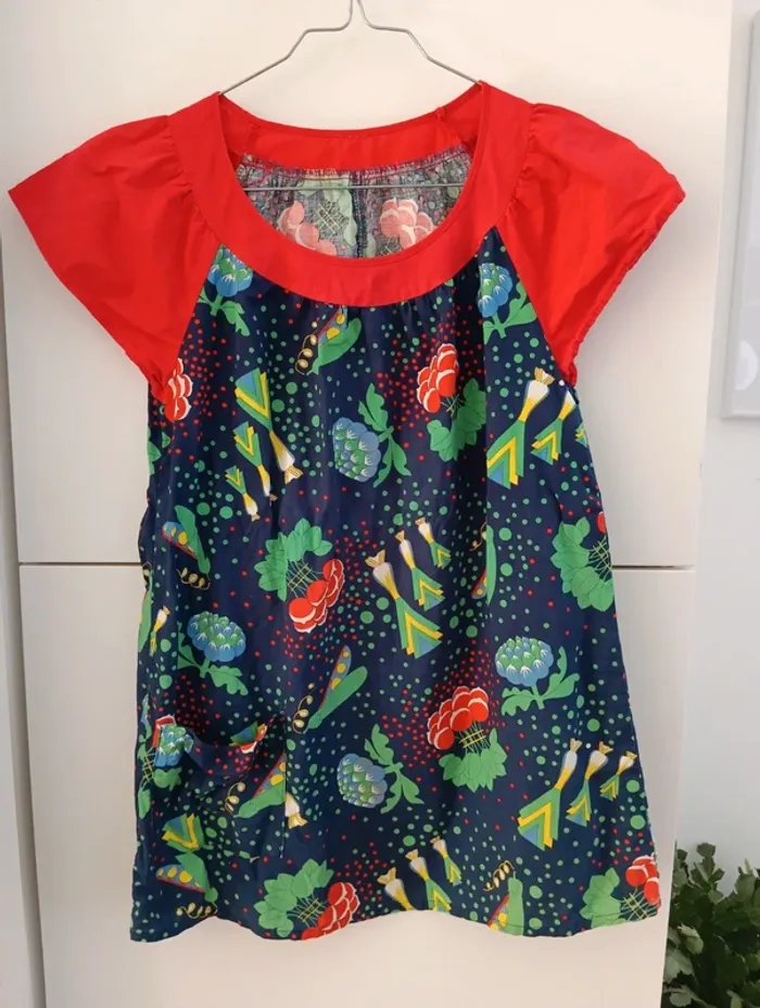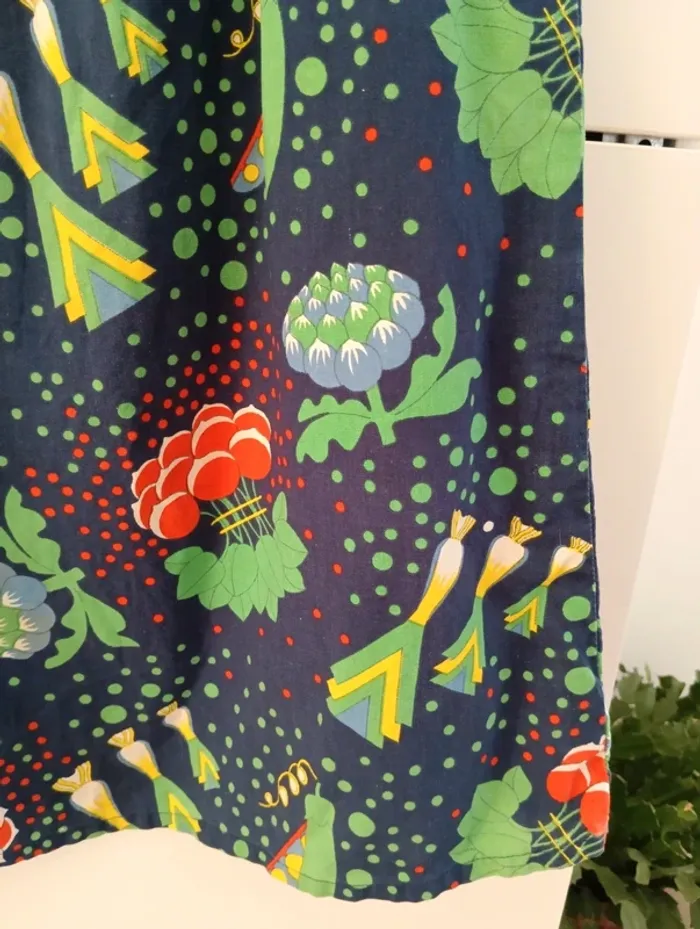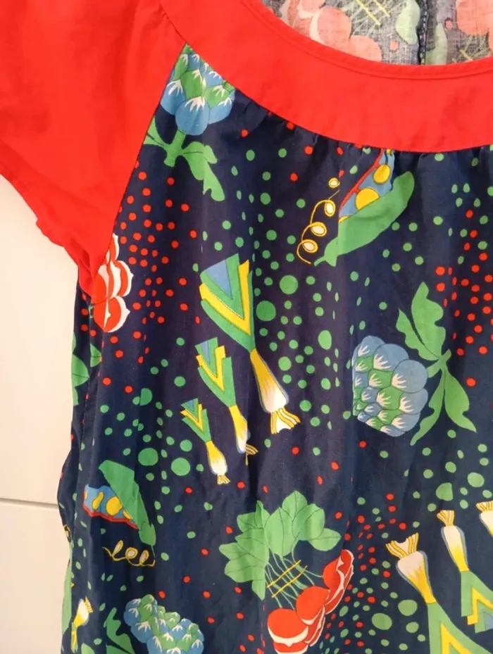 Blouse vintage imprimé légumes Encolure et manches rouges, fond marine, légumes multicolores ( radis, poireaux, artichauts) Bas évasé Taille 40 estimée à confirmer avec les mesures et selon l'effet souhaité. Aisselles 47 cm longueur 70cm Reprisée aux aisselles, voir dernières photos