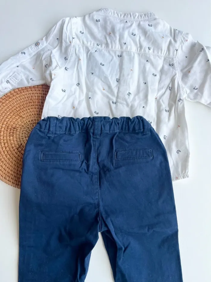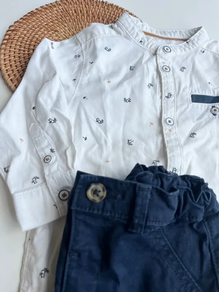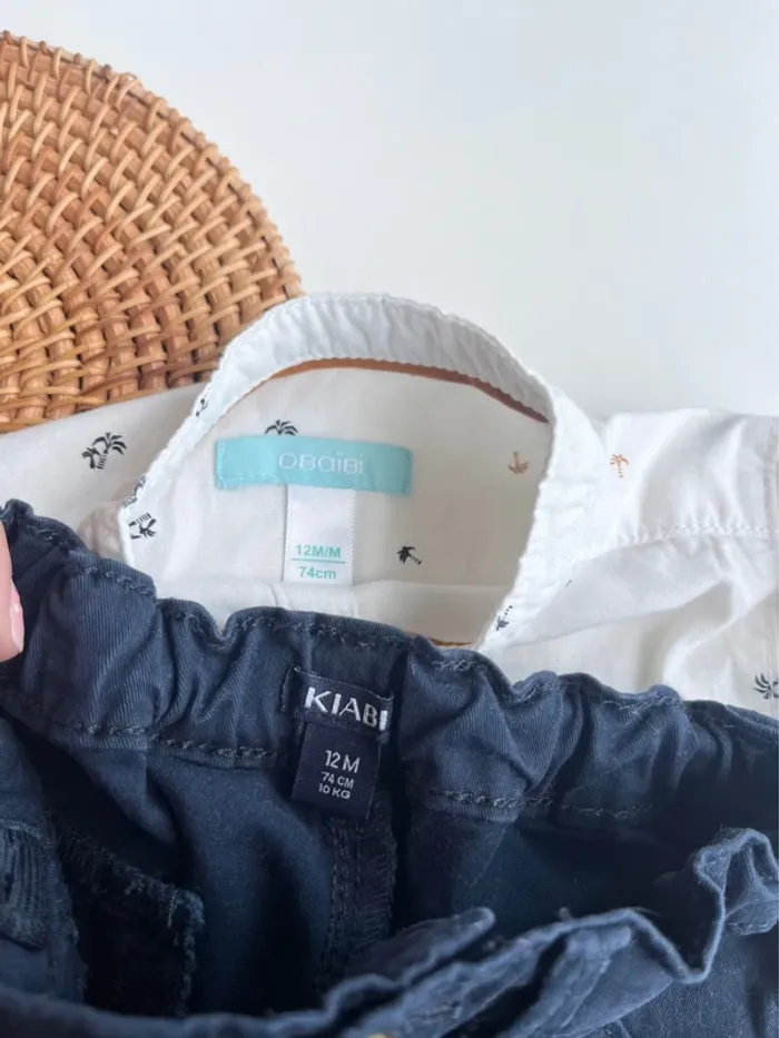 Look habillé bébé Chemise Obaibi 12 mois (74cm) Motifs palmier Chino bleu marine Kiabi 12 mois (74cm) Ceinture réglables Le tout en excellent état #bebe12moisvidedressingdu40