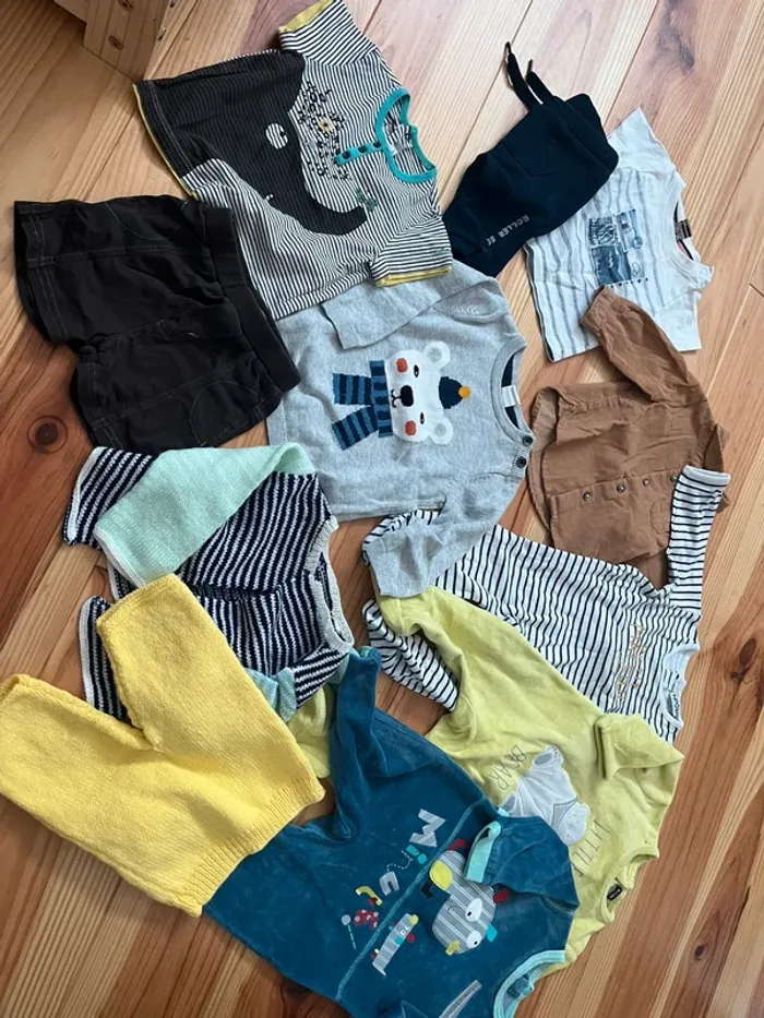 1€ le vêtement En 3 mois la chemise, le tee shirt, le jogging bleu, et le pantalon jaune Le reste 6 mois Photo en détails dans mon dressing 1 petit défaut sur chaque pyjama le reste en très bon état voir neuf pour certains
