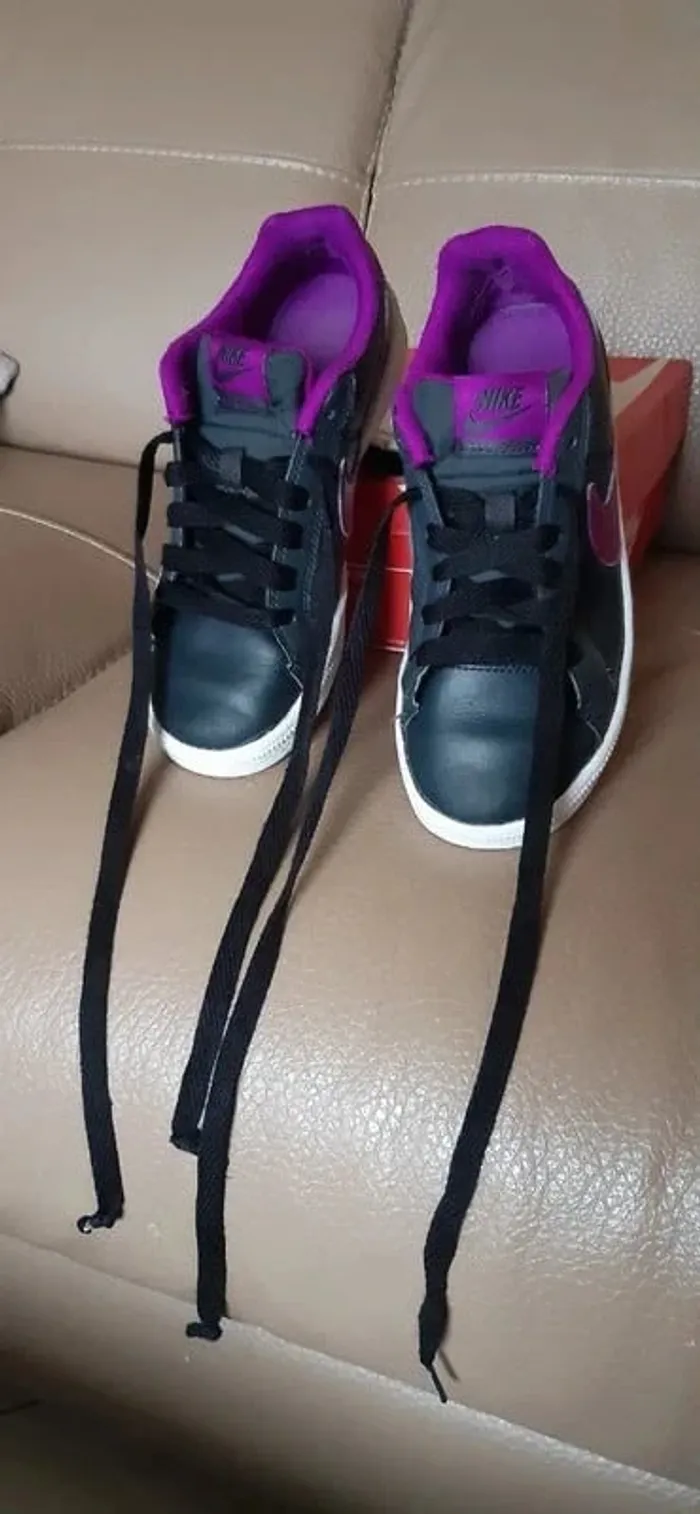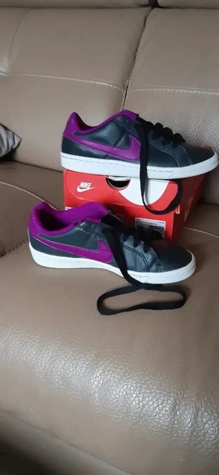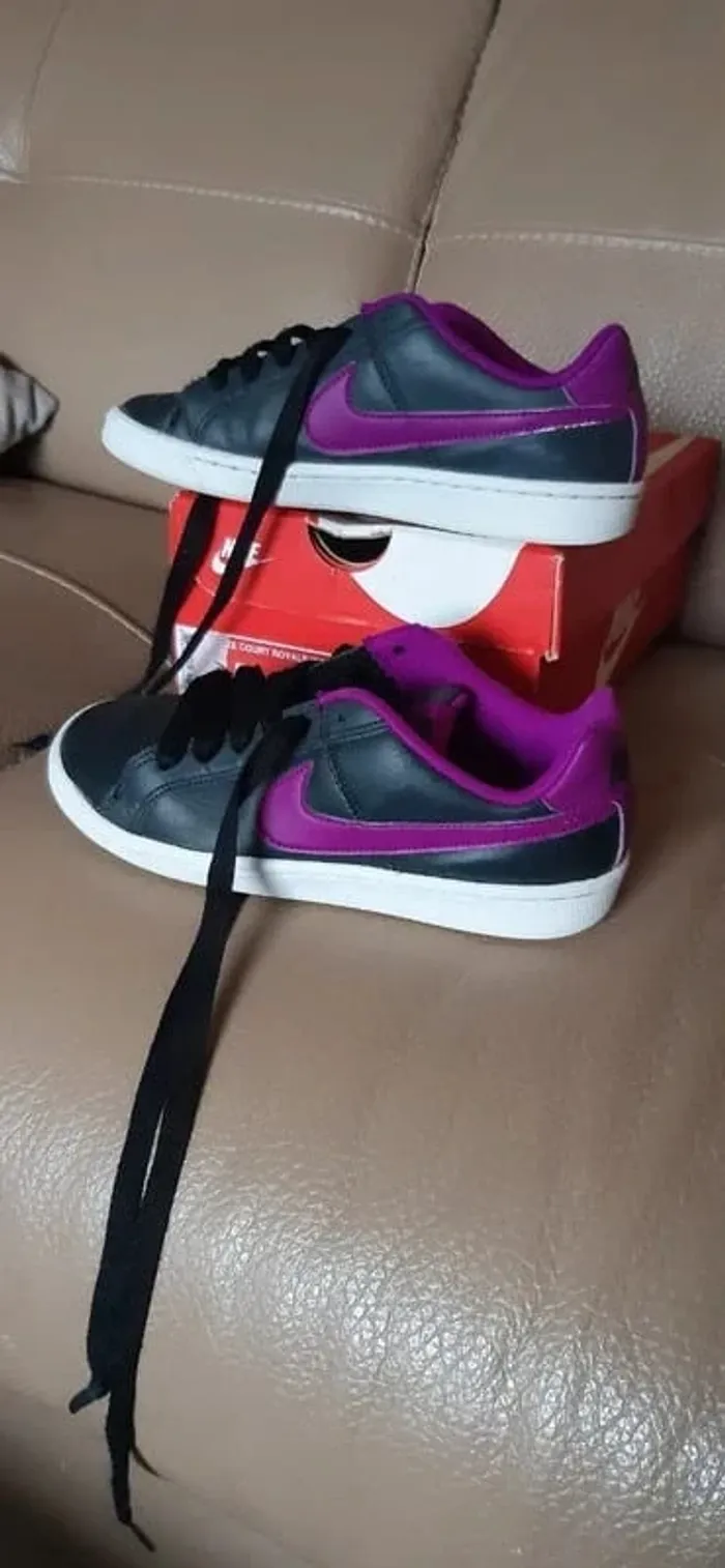 JE N'ACCEPTE PAS D'OFFRE MERCI Chaussures/ baskets nike court royale anthracite logo nike violet pointure 35,5 Vendues avec boite d'origine Portées mais restent en très bon état (Bouts de lacets "abimées + légèrement abimées sur une chaussure en haut du laçage) conformes aux photos Très très propres