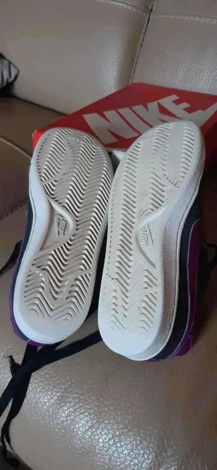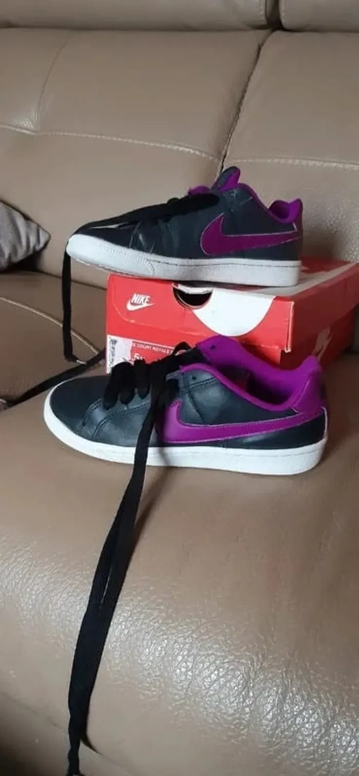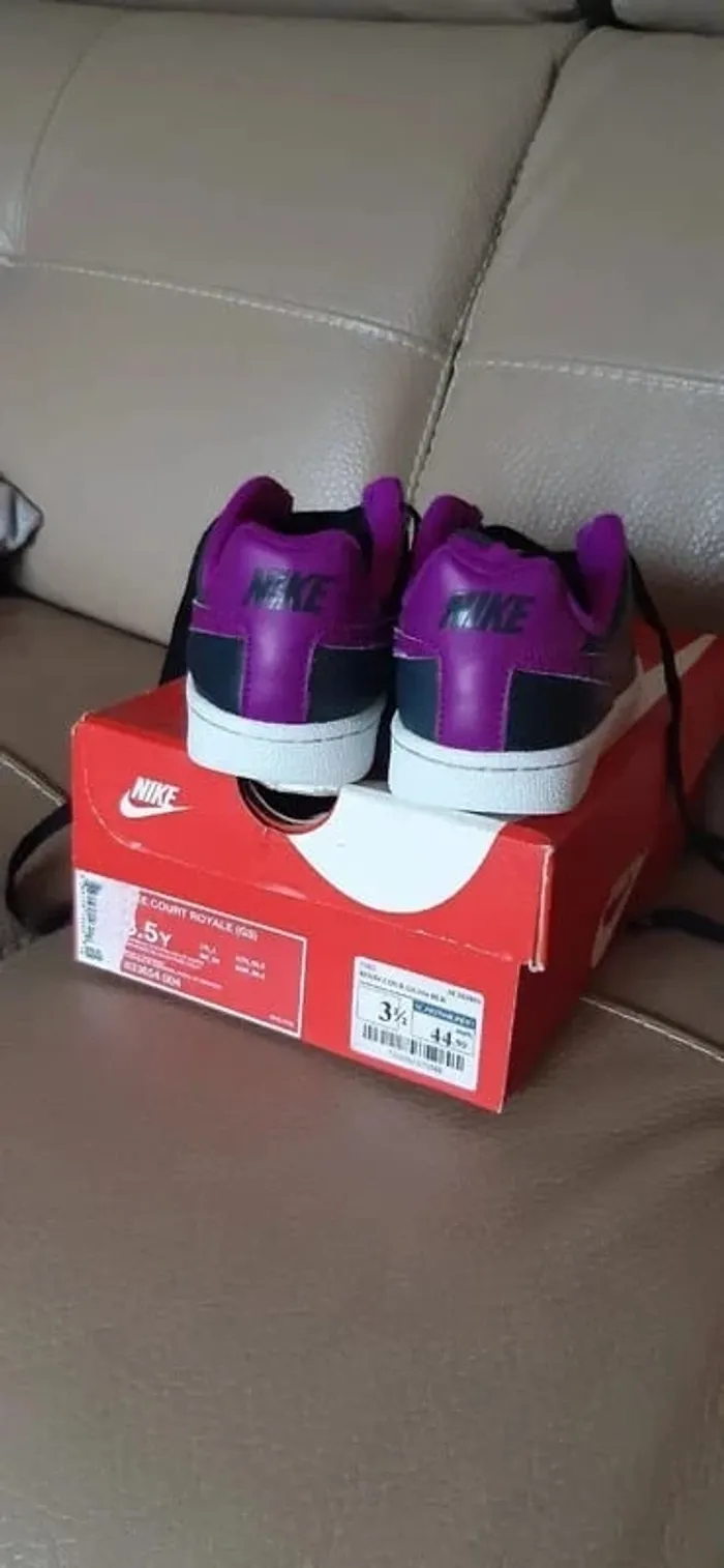 JE N'ACCEPTE PAS D'OFFRE MERCI Chaussures/ baskets nike court royale anthracite logo nike violet pointure 35,5 Vendues avec boite d'origine Portées mais restent en très bon état (Bouts de lacets "abimées + légèrement abimées sur une chaussure en haut du laçage) conformes aux photos Très très propres