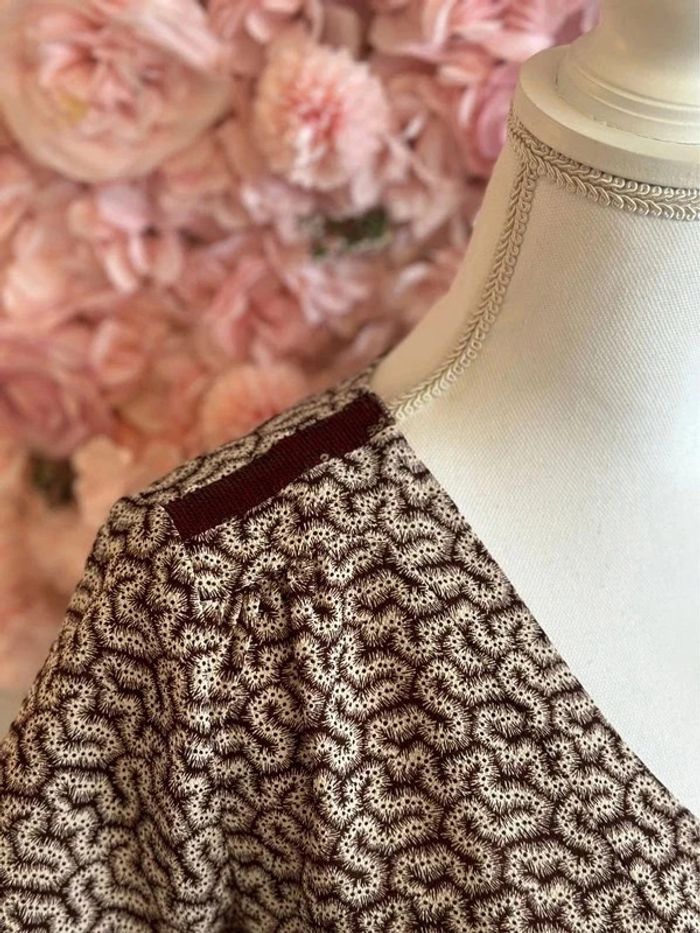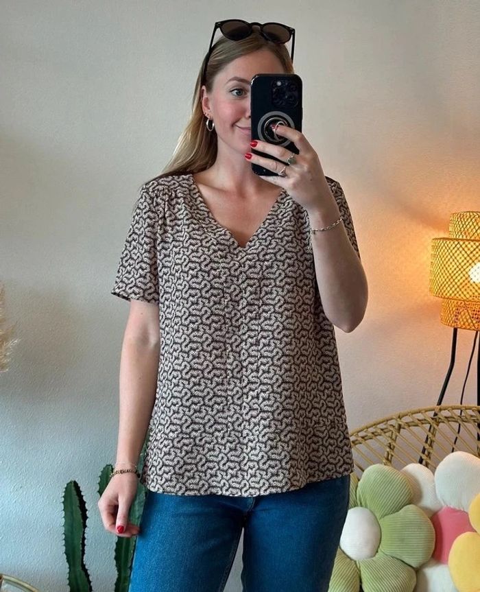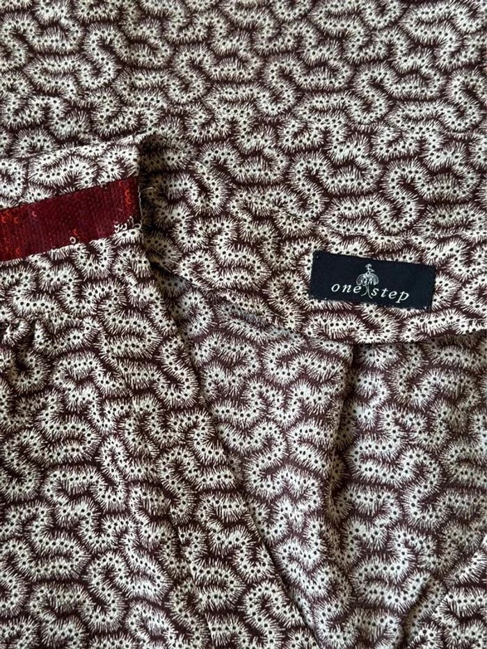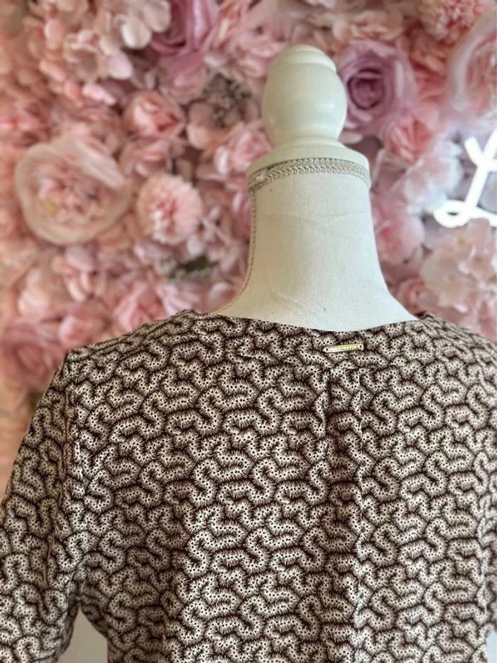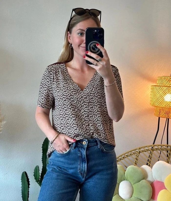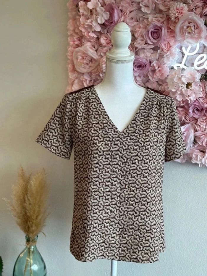 En parfait état, quasiment neuf. Prix d’achat 75€. Ce haut à motifs marron et blanc est doté d’un col en V et de détails en sequins bordeaux sur les épaules. La taille 40 convient parfaitement pour un confort optimal.