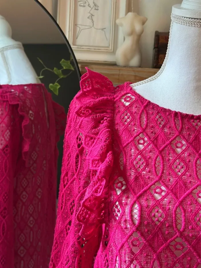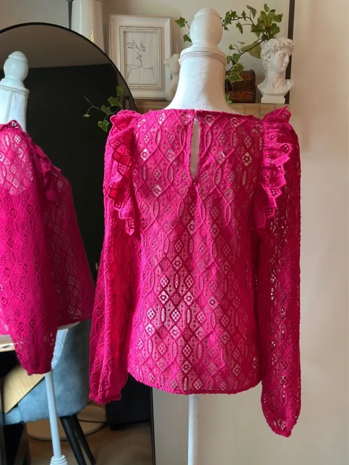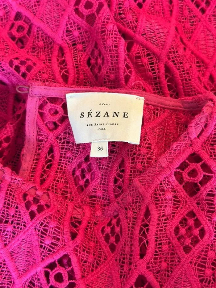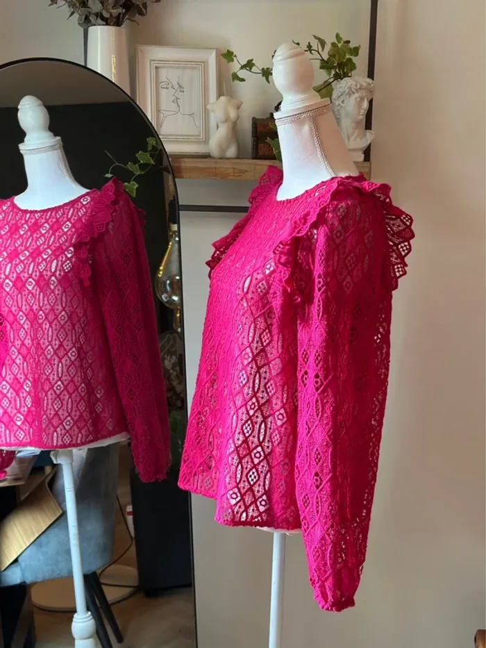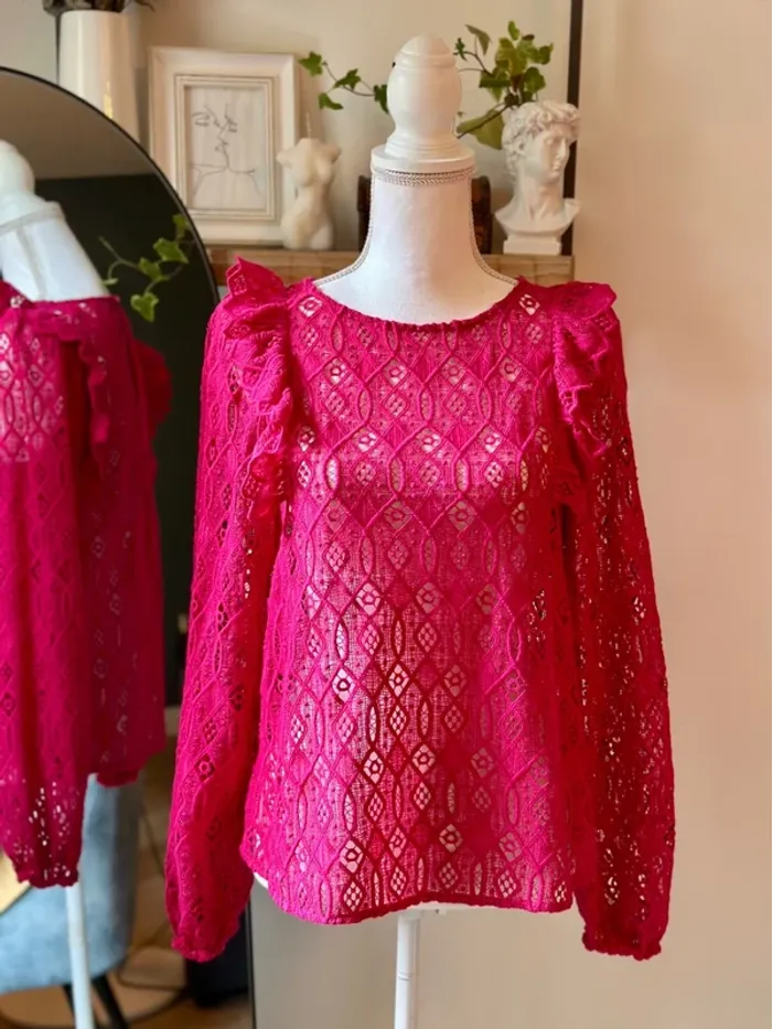 Modèle Salina de la marque Sézane, blouse à manches longues en guipure (matière bio) dans une jolie teinte framboise. Coupe droite fluide avec encolure arrondie, volants délicats sur les épaules et bouton goutte au dos. Longueur classique la taille 36 convient bien, très belle tenue, chic et féminine. Composition douce et agréable.