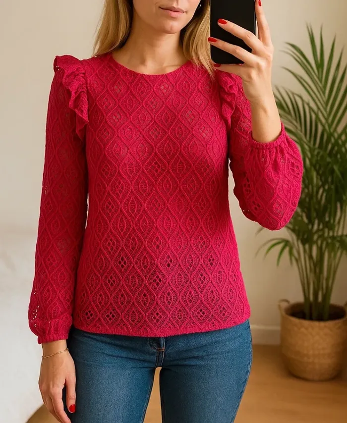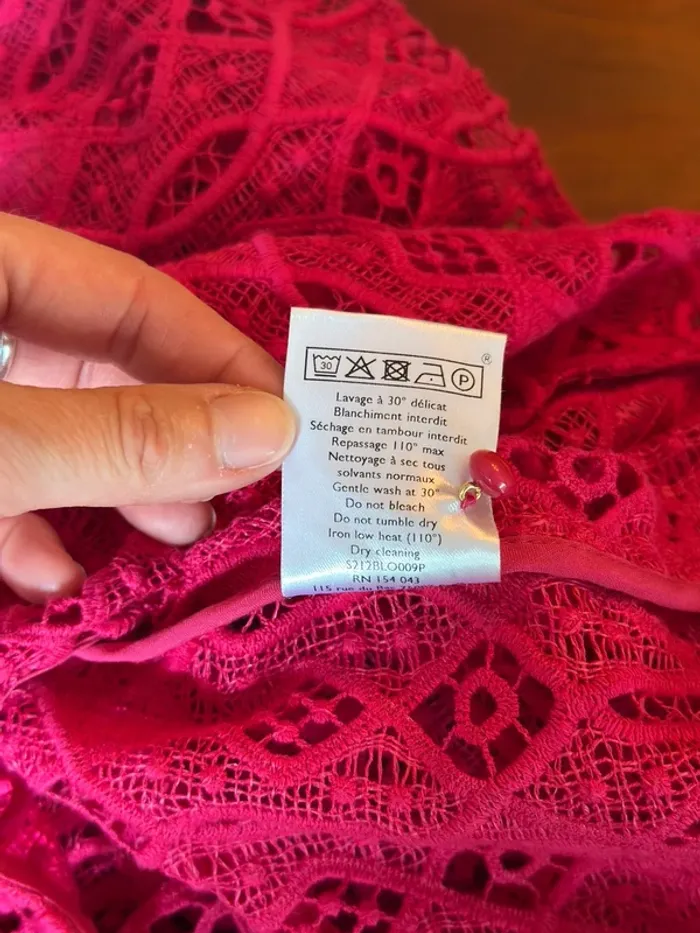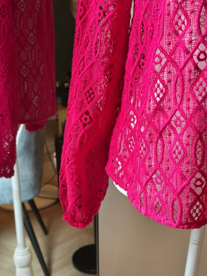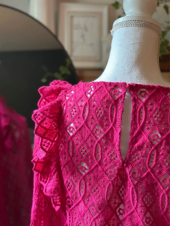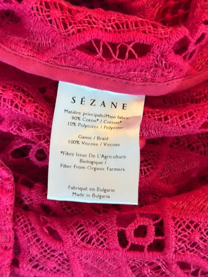 Modèle Salina de la marque Sézane, blouse à manches longues en guipure (matière bio) dans une jolie teinte framboise. Coupe droite fluide avec encolure arrondie, volants délicats sur les épaules et bouton goutte au dos. Longueur classique la taille 36 convient bien, très belle tenue, chic et féminine. Composition douce et agréable.