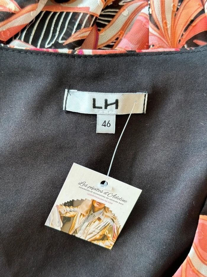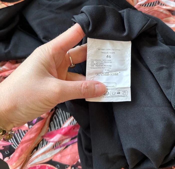 En parfait état, comme neuve. Belle robe longue à motifs fleuris dans les tons rose pale, corail noir, écru. Col cache cœur, liens ajustable à la taille. Bien ajustée sans. Doublure. Taille 46 sur l'étiquette convient mieux à un 44 d'après les mesures. C'est pourquoi je la classe dans cette taille là. Peut également convenir pour une taille plus petite grâce à son ajustement par lien. Longueur 130cm, épaule 45cm, aisselle 55cm.